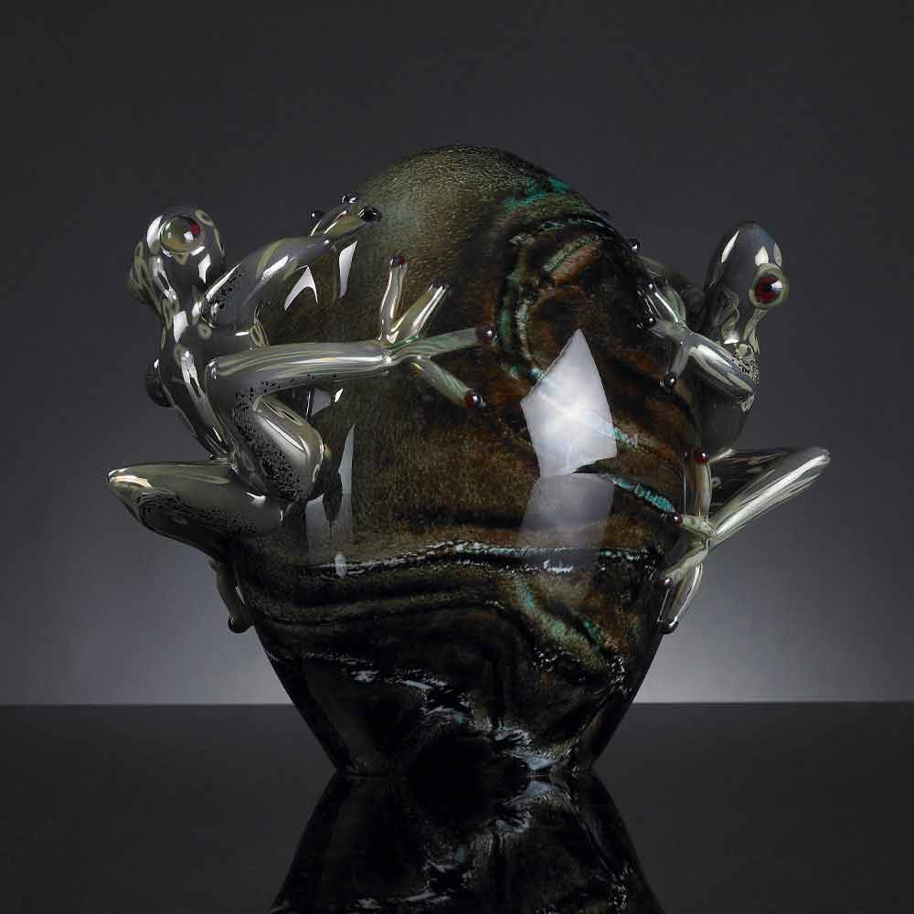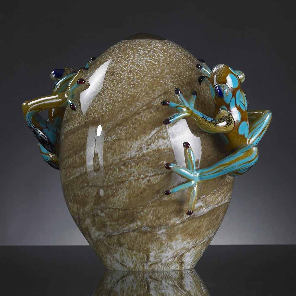 تمثال زخرفي على شكل ضفادع على بيضة ، مصنوع في إيطاليا من زجاج ملون . قطعة أثاث أنيقة تجمع بين رقة الزجاج الخالدة وألوان زاهية وحيوية، تضفي على المنتج لمسةً أصليةً وتؤكد قيمته. تُثري التشطيبات الرائعة والأشكال الجديدة والمبتكرة هذه القطعة، مما يجعلها الحل الأمثل لمن يبحثون عن أسلوب إبداعي ومميز لمنزلهم، يُضفي أجواءً مميزةً على المكان.