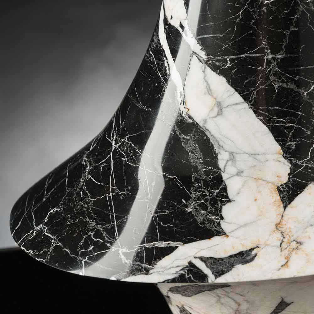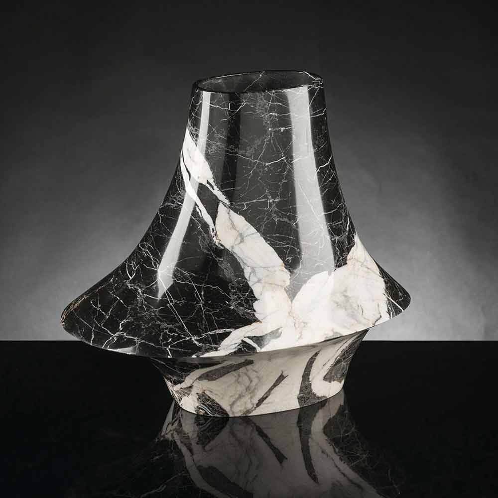 مزهرية زخرفية داخلية مصنوعة من الرخام الأسود مع عروق بيضاء من خلال إنتاج إيطالي 100% . يتم إنتاجه من خلال معالجة الأحجار الطبيعية باستخدام بانتوغرافات خماسية المحاور، مما يسمح بالحصول على أشكال أكثر تعقيدًا من مجرد أحجام دوران بسيطة. تنبع هذه القطعة الأنيقة من دراسة الظواهر الطبيعية وتفاعل المواد المستخدمة مع التكنولوجيا البشرية، لإضفاء طابع فريد وعصري على أسلوب الأثاث. والنتيجة عنصر ديكوري فريد قادر على إثراء أي بيئة بجماليات عصرية وراقية ذات طابع شخصي. إنه أسلوب مثالي لمختلف البيئات، من أثاث المنازل إلى الفنادق والمطاعم ومناطق التعاقد والمنتجعات الصحية، بالإضافة إلى أماكن إقامة الفعاليات وحفلات الزفاف.