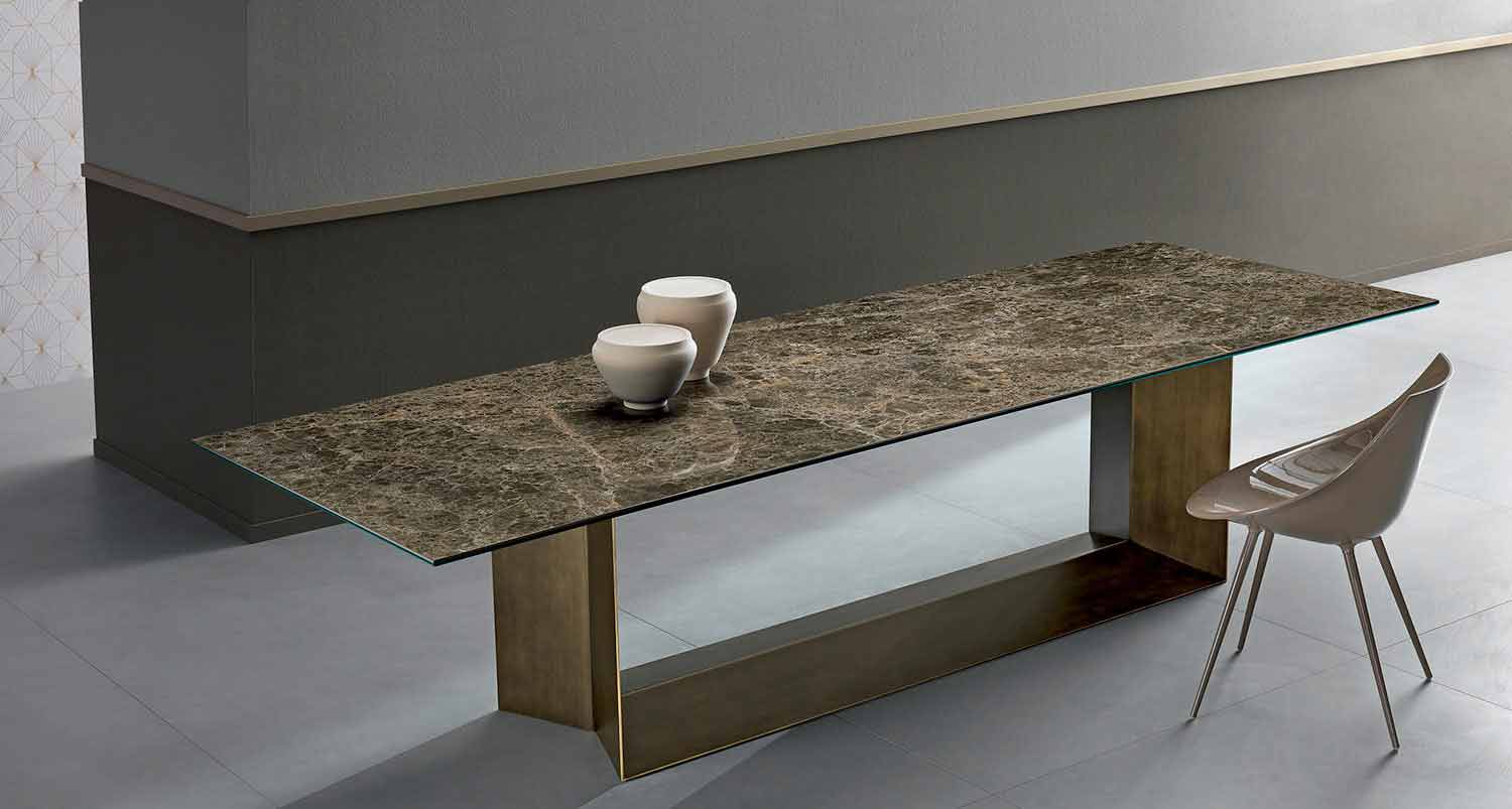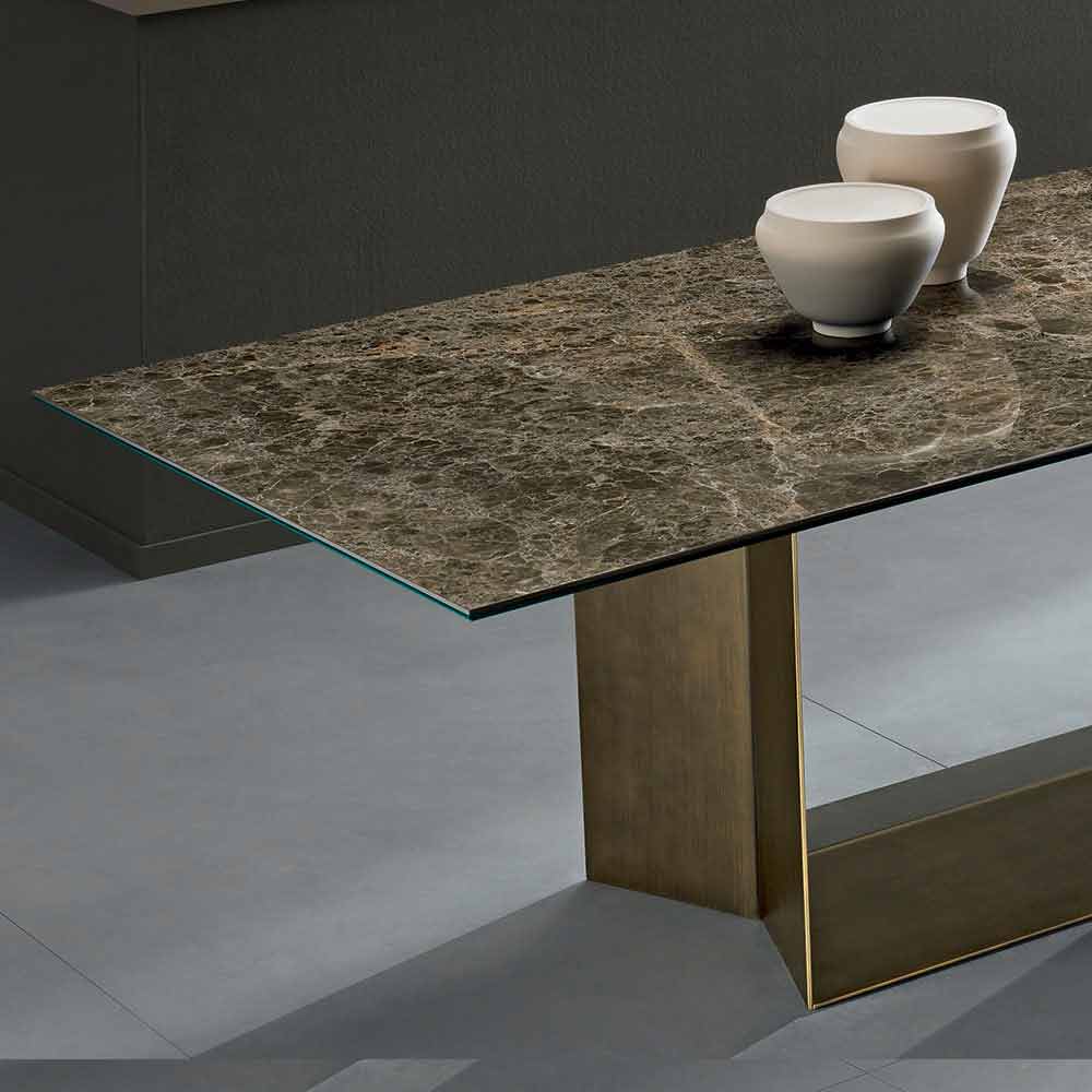 طاولة مطبخ فاخرة مع سطح من السيراميك الامبراطوري المصقول وقاعدة معدنية برونزية مصقولة، صنع في إيطاليا.