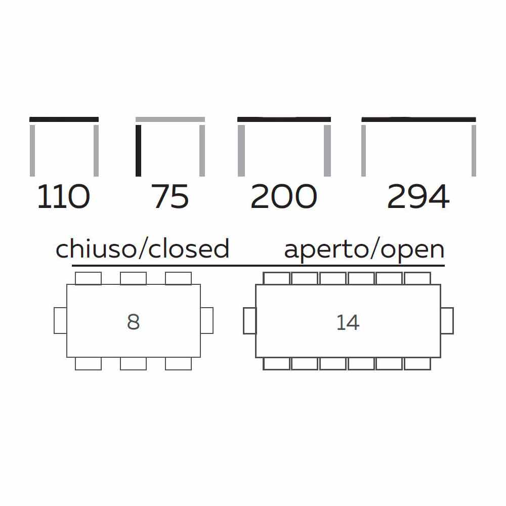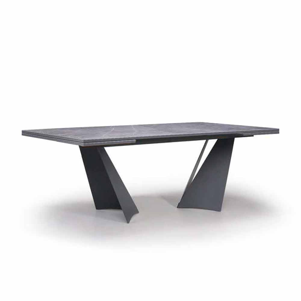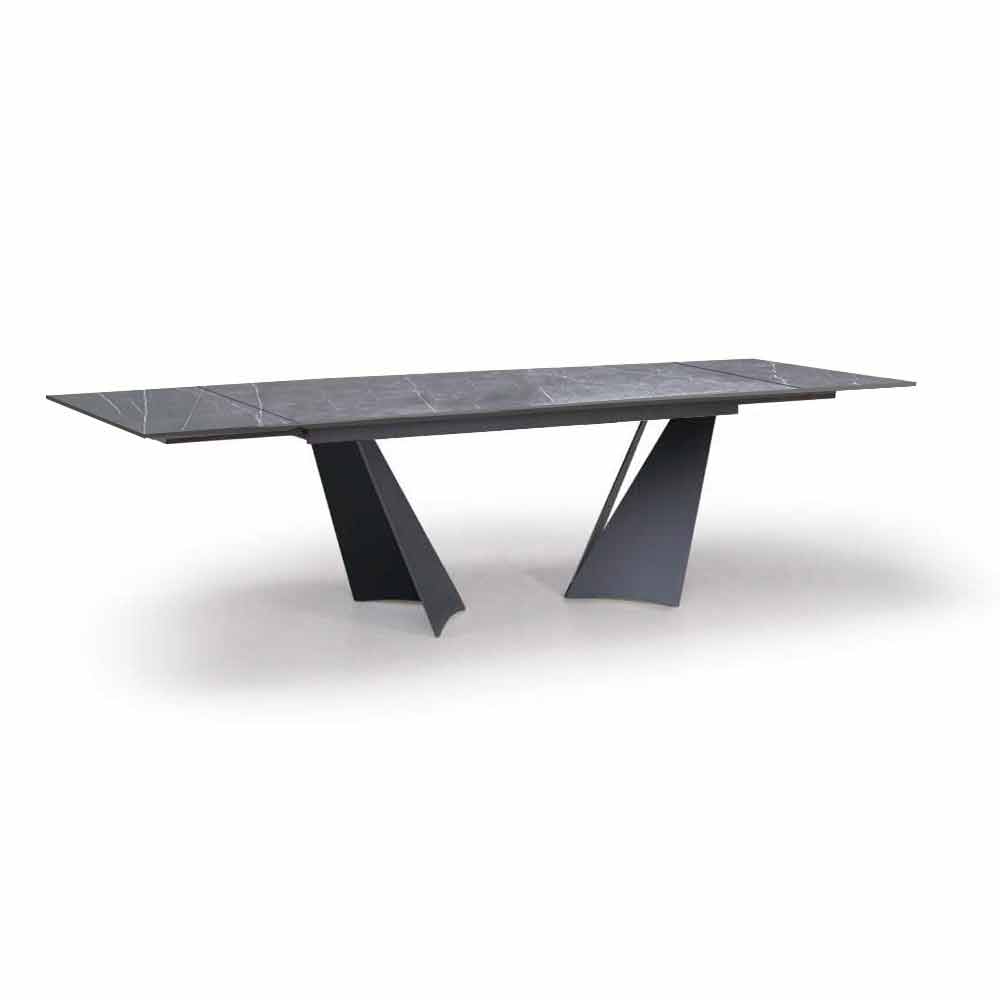 تتميز طاولة الطعامالإيطالية هذه بتصميممبتكر وأنيق بفضل مزيج المواد والتشطيبات المستخدمة، مما يجعلها مثالية للأماكن ذات الطابع العصري والراقي. وتتجلى خصوصية الطاولة بلا شك في هيكلها غير المعتاد للساقين المعدنيين المطليين اللذين لا يرتكزان بالكامل على الأرض، بل على نقطتين فقط، مما يزيد من سحرها. وبفضل شكلها تحديدًا، تبدو القاعدة خفيفة ونحيفة، لكنها في الواقع متينة ومستقرة، إذ لا تتحمل وزن الأرضية المصنوعة من الخزف الحجري ، الذي غالبًا ما يبلغ 2.5 سم (6 مم من الخزف الحجري، و19 مم من ألواح MDF)، والذي يمكن أن يصل طوله إلى 294 سم، بفضل وجود امتدادين قابلين للإزالة بطول 47 سم، مما يسمح باستيعاب ما يصل إلى 14 شخصًا لتناول الغداء والعشاء مع الأصدقاء.