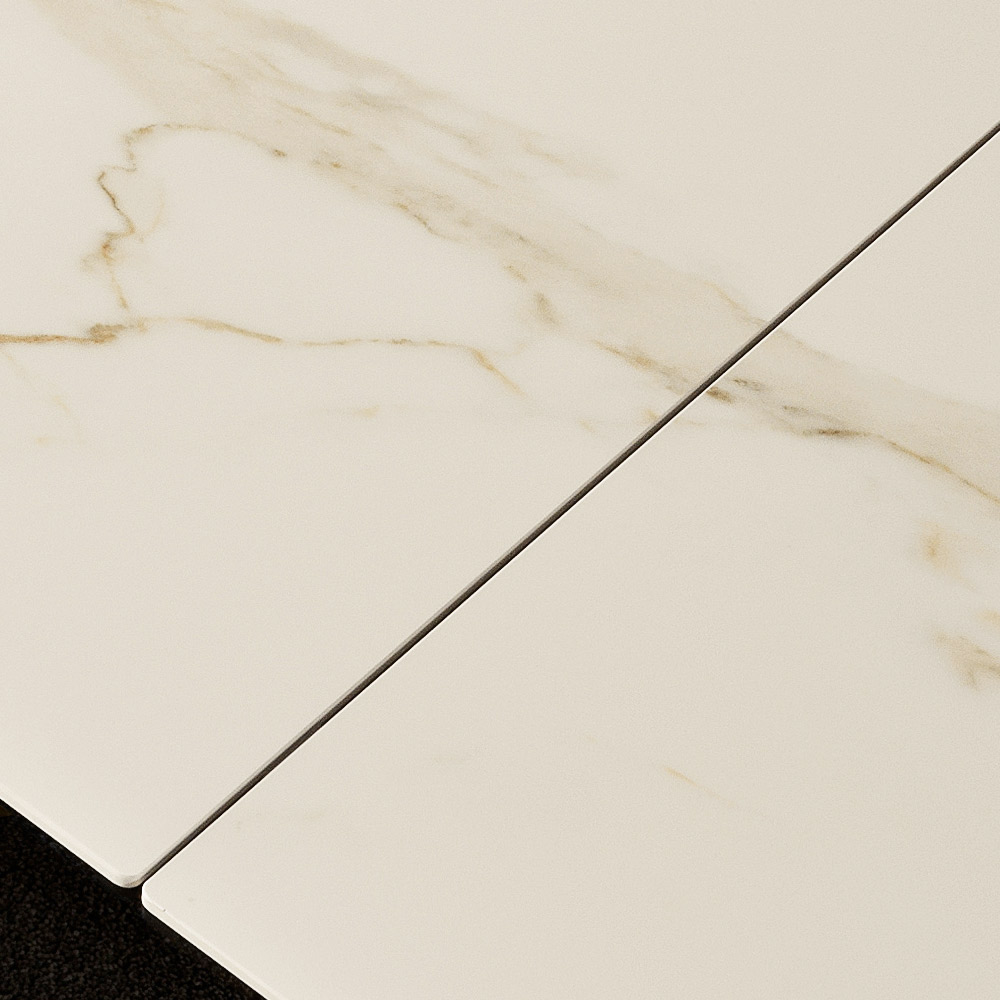 القاعدة عبارة عن منحوتة هندسية تتحدى الجاذبية: الأرجل المعدنية، بأشكالها المتعرجة، مصممة ليس فقط لتوفير دعم مثالي، بل أيضًا لإضفاء لمسة بصرية مميزة على الطاولة. هذا الدمج بين المواد والتصميم المعاصر يلفت الأنظار، ويصبح القطعة المركزية لغرفة الطعام.
