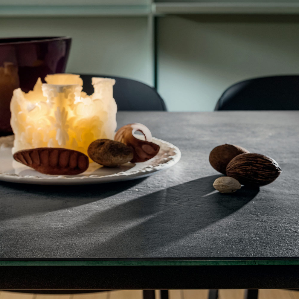 طاولة طعام مصنوعة في إيطاليا، بسطح من اللامينيم (خزف حجري) مع دعامة زجاجية وأرجل من الألومنيوم المطلي بالإيبوكسي بلمسة نهائية من الفحم. تتميز هذه الطاولة بسطحها اللامينيم، وهو سطح سيراميكي ثوري مصنوع من خليط من الخزف الحجري، مما يمنحها سطحًا مقاومًا للمذيبات والمطهرات والمنظفات، بالإضافة إلى الخدوش والجروح العميقة. كما أنها سهلة التنظيف وسريعة الاستخدام، مع الحفاظ على خصائصها المميزة. يتميز تصميمها بخطوط بسيطة غنية بلمسات نهائية أنيقة للغاية، مما يجعلها الحل الأمثل لإكمال مساحاتك بأناقة وشخصية مميزة، حيث تجمع بين العملية والجمالية الفريدة في قطعة واحدة. إلى جانب جمالياتها الآسرة والراقية، نجد جانبًا عمليًا قويًا، يعززه السطح القابل للتمديد بفضل الامتدادات المتوافقة، مما يتيح إمكانية استقبال عدد أكبر من الضيوف الذين يعودون لشغل مساحة أصغر بعد إغلاقها. ملاحظة: يتم إجراء الامتدادات في HPL.