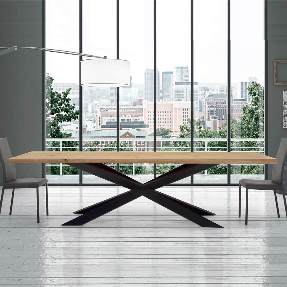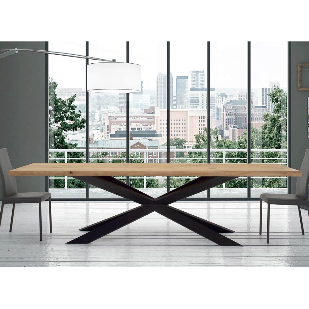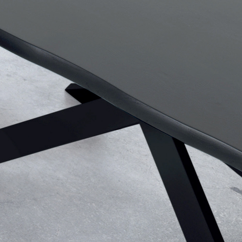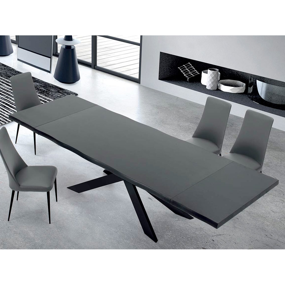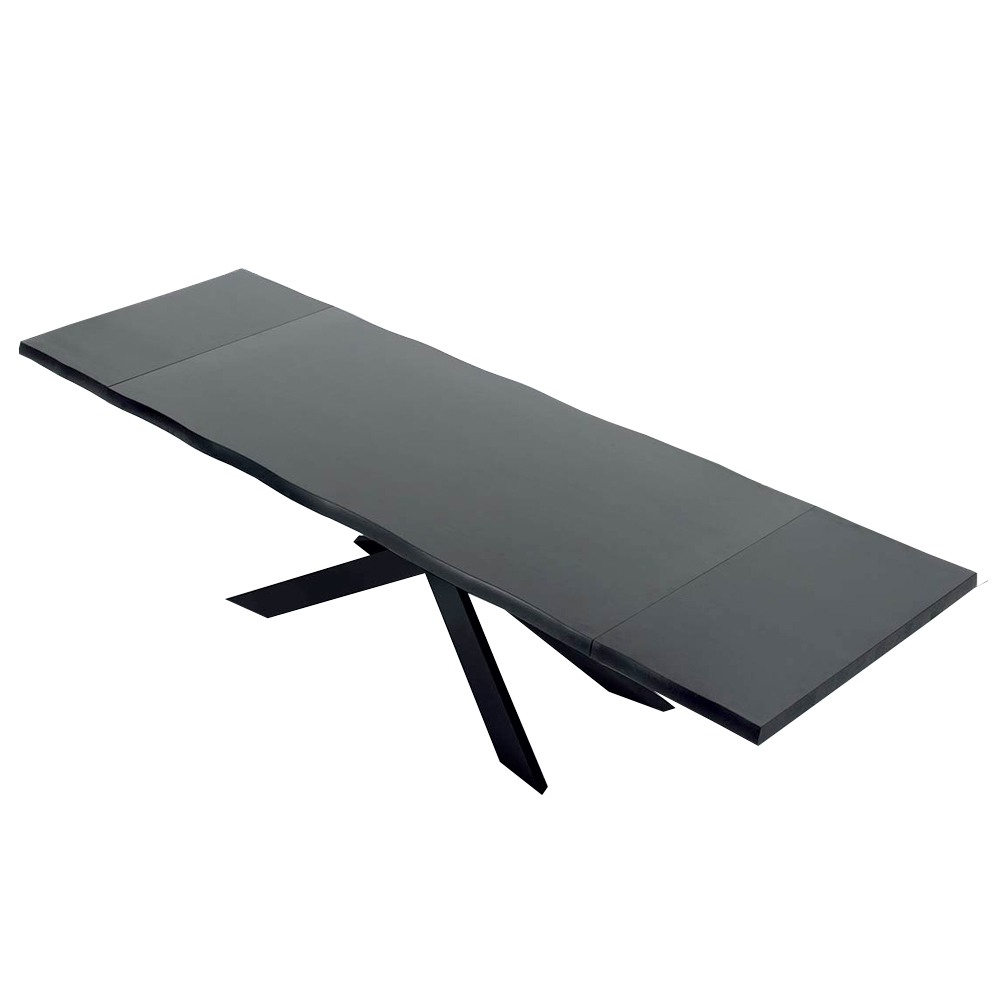 طاولة طعام قابلة للتمديد حتى 300 سم من الخشب المقشر وقاعدة فولاذية سوداء، صنع في إيطاليا.