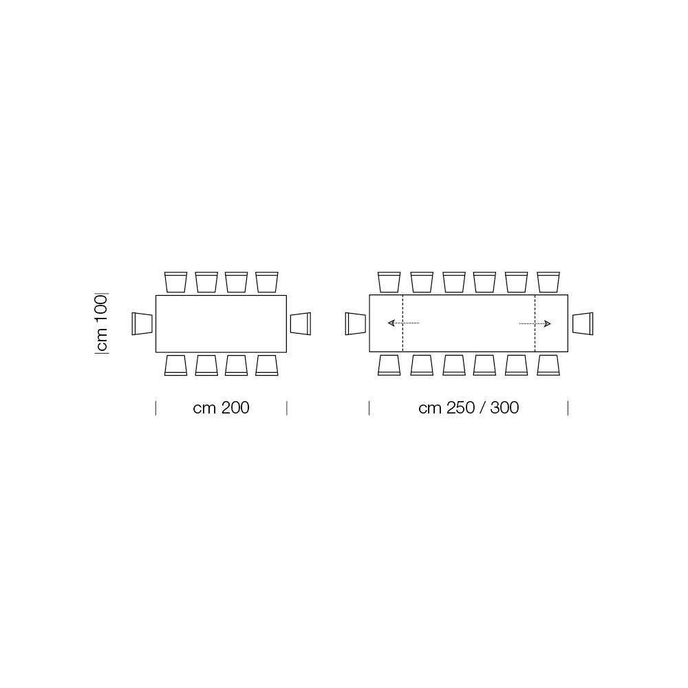 طول 200 (300) × عمق 100 × ارتفاع 76.5 سم، 14 مقعدًا قابلة للتمديد مع امتدادين خارجيين بطول 50 سم.