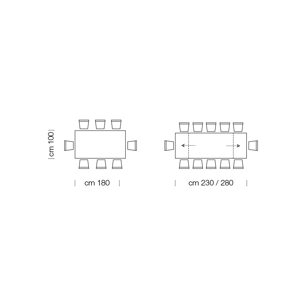 طول 180 (280) × عمق 100 × ارتفاع 75.3 سم، 12 مقعدًا قابلة للتمديد مع امتدادين خارجيين بطول 50 سم؛