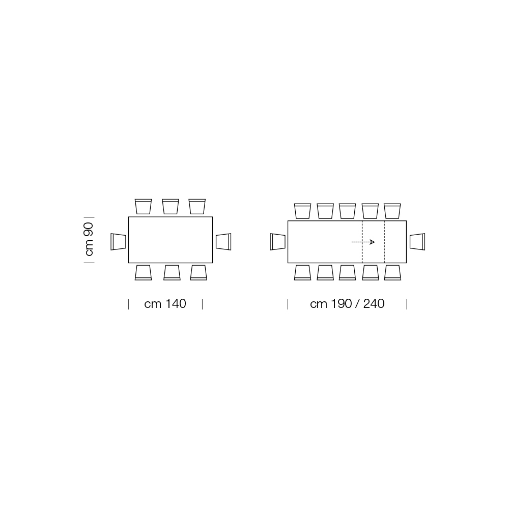 طول 140 (240) × عمق 90 × ارتفاع 75 سم، 12 مقعدًا قابلة للتمديد مع امتدادين داخليين بطول 50 سم لكل منهما؛