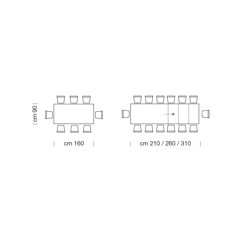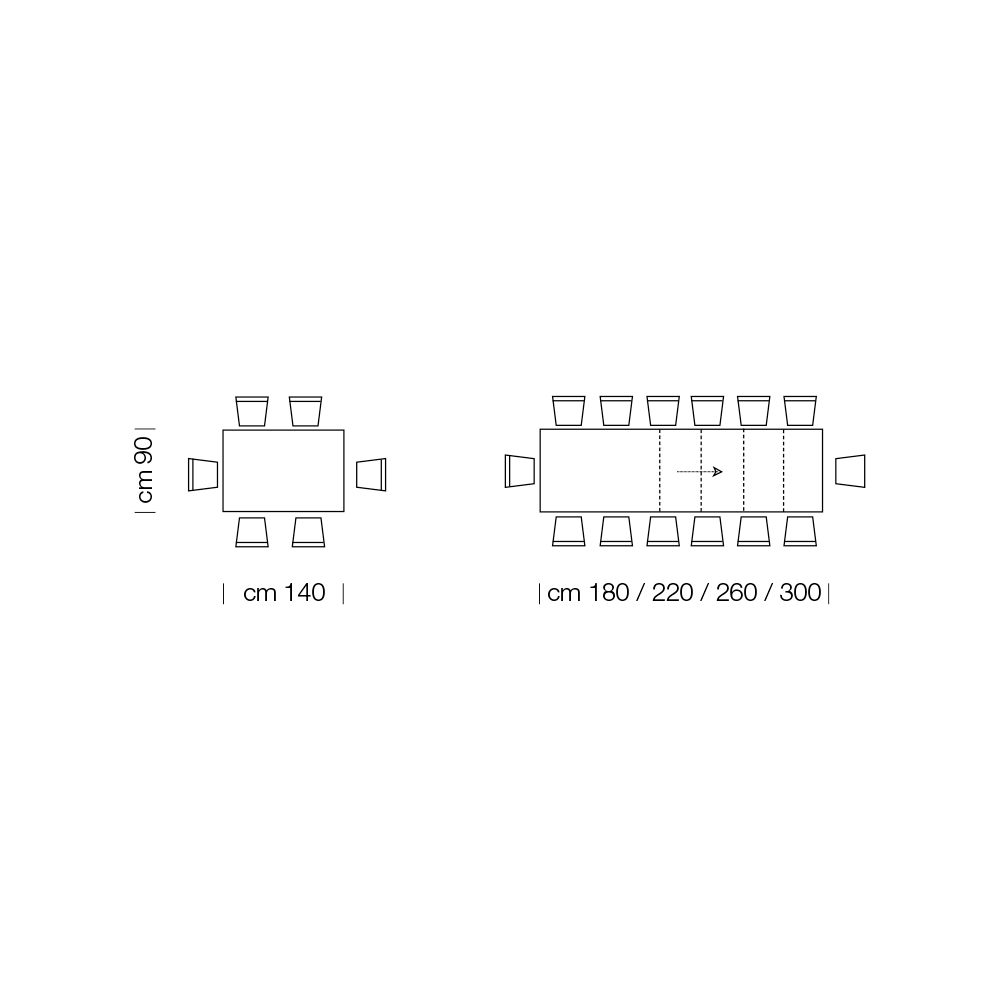 طول 160 (260) × عمق 90 × ارتفاع 75 سم، 12 مقعدًا قابلة للتمديد مع امتدادين داخليين يبلغ طول كل منهما 50 سم؛