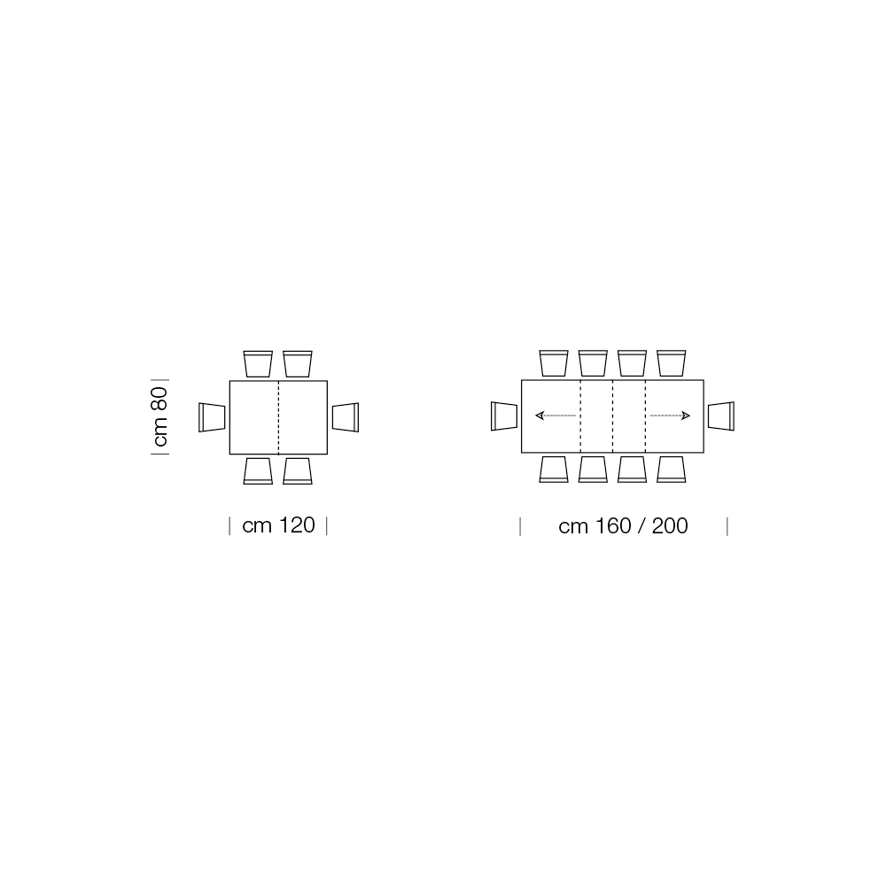 طول 120 (200) × عمق 80 × ارتفاع 77 سم، 10 مقاعد قابلة للتمديد مع امتدادين داخليين بطول 40 سم؛