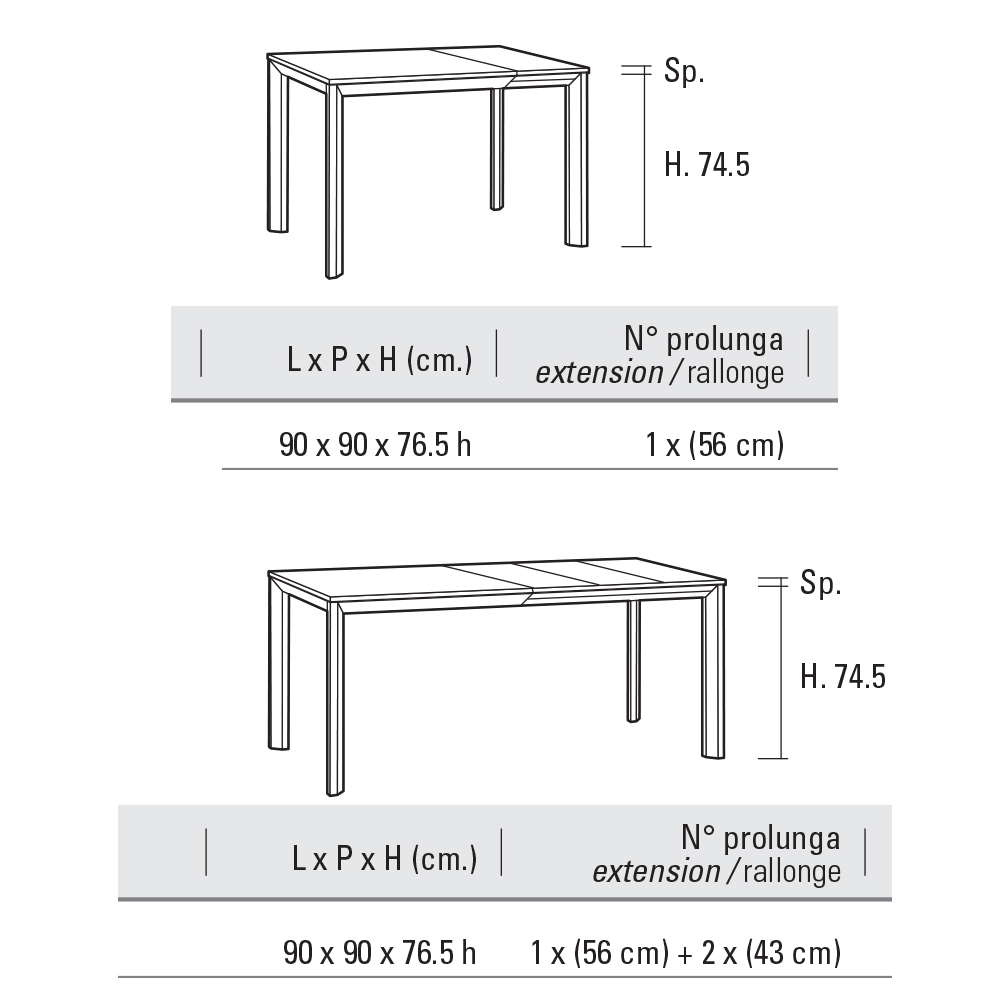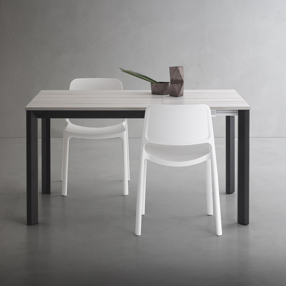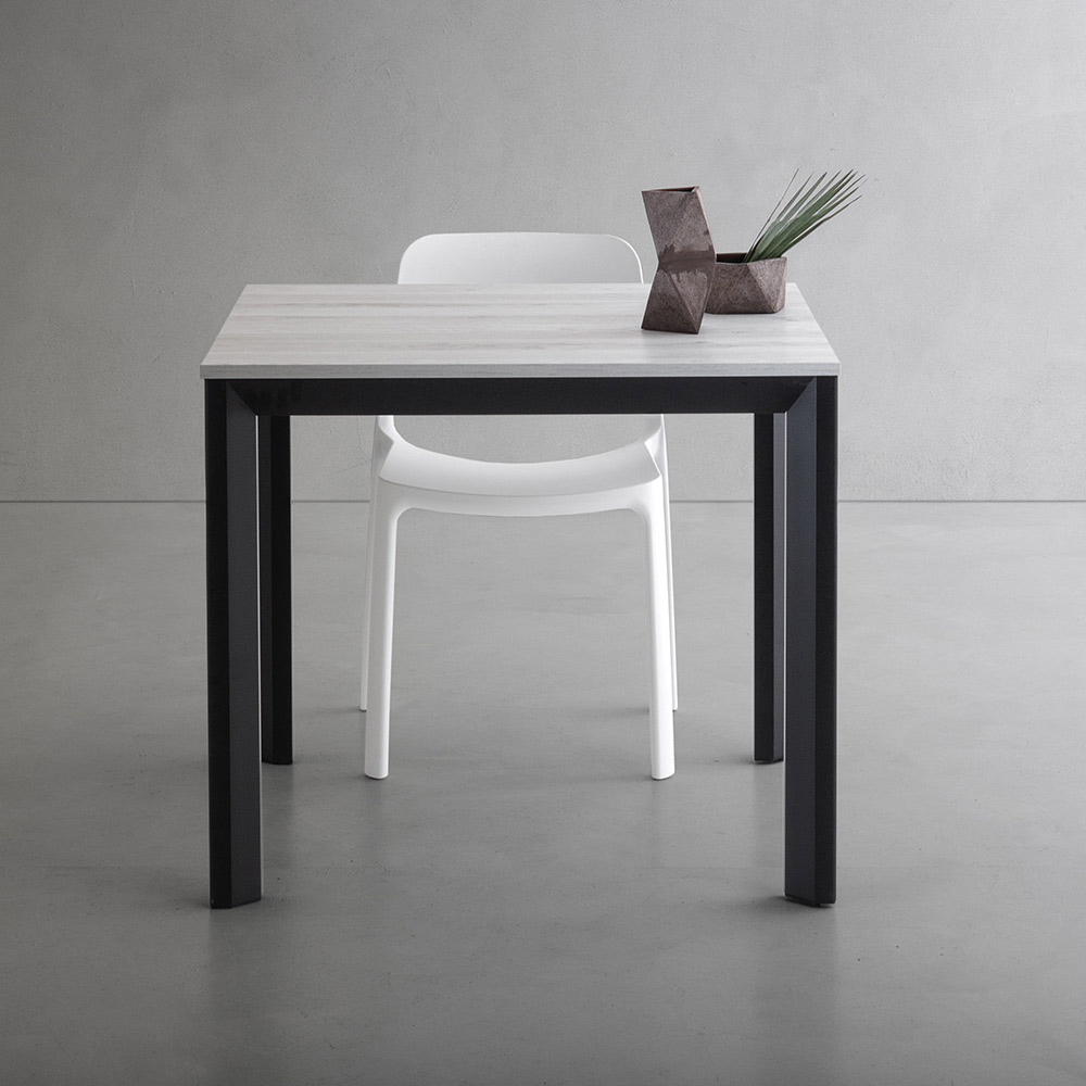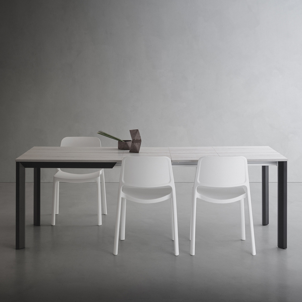 طاولة مطبخ مربعة قابلة للتمديدمصنوعةفي إيطاليا بأرجل من الألومنيوم المؤكسد باللون الأسود غير اللامع، وسطح من مادة HPL مع دليل من الألومنيوم على انزلاقات من الراتنج الأسيتالمتوفر بتشطيبات مختلفة وفي حجمين مختلفين.