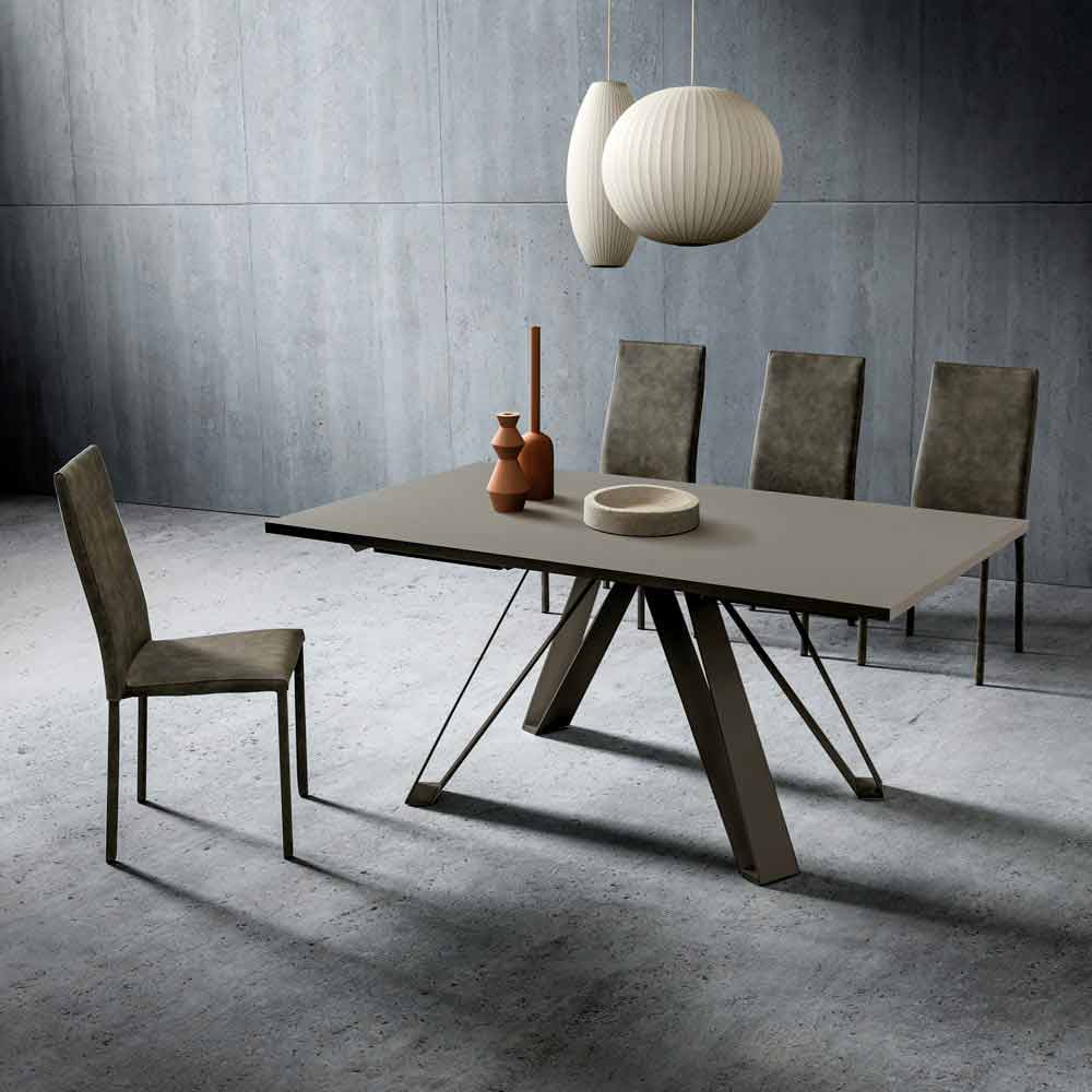 طاولة طعام بسطح فينيكس قابل للتمديد (سمك 30 مم) بتشطيب شبكي لندن وقاعدة مصنوعة من المعدن المطلي بمساحيق إيبوكسي بنفس لون السطح. ما يزيد من جودة وقيمة الطاولة هو اختيار استخدام فينيكس، وهي مادة توفر من خلال استخدام الراتنجات المبتكرةسطحًا مقاومًا ولطيفًا عند اللمس ومعتمًا للغاية ، مما يحسن النتيجة النهائية ويعظم جانبها الوظيفي. إلى جانب هذه الميزة، فإنها تقدم أيضًا إمكانية تمديد السطح حتى 280 سم كحد أقصى بفضل امتدادين جانبيين (40 سم لكل منهما) مع آلية فتح قابلة للطي. وبهذه الطريقة تصبح الطاولة حلاً تأثيثًا مناسبًا بشكل خاص لأولئك الذين يحبون تنظيم وجبات الغداء والعشاء من خلال استضافة الأصدقاء والأقارب لقضاء لحظات رائعة برفقتهم، والعودة إلى احتلال مساحة أصغر بمجرد إغلاقها. على المستوى الجمالي، فإن العنصر الذي يثري جماليتها هو القاعدة المعدنية التي تعطي عنصرًا أصليًا وإبداعيًا ، ويكمل المظهر النهائي بلمسة من الحداثة ويسمح للطاولة بأن تصبح البطل الحقيقي للغرفة، وتحظى بكل الاهتمام.