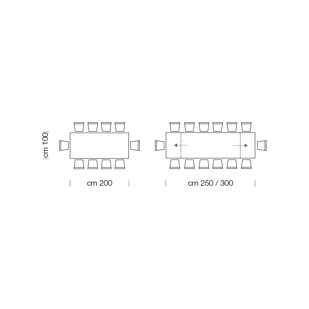 طول 200 (300) × عمق 100 × ارتفاع 76.5 سم، 14 مقعدًا قابلة للتمديد مع امتدادين خارجيين بطول 50 سم.
