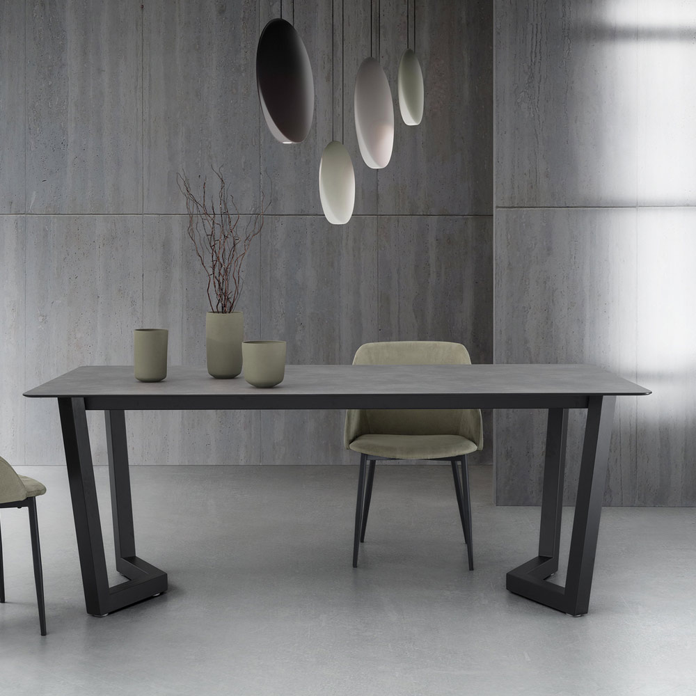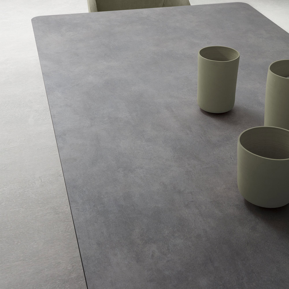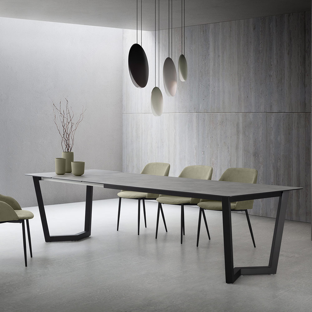 طاولة مطبخ قابلة للتمديد مع قاعدة معدنية مطلية بمساحيق إيبوكسي باللون الأسود، وسطحHPL متعدد الطبقات متوفر بتشطيبات مختلفة ودليل للتمديداتمن الألومنيوم المطلي بألواح تزلج عملية، صُنع في إيطاليا . يُركز تصميمه الجمالي بالكامل على أسلوب عملي وعصري ، وهي سمات أساسية لخلق تناغم فريد داخل الغرفة.