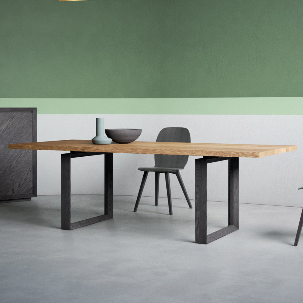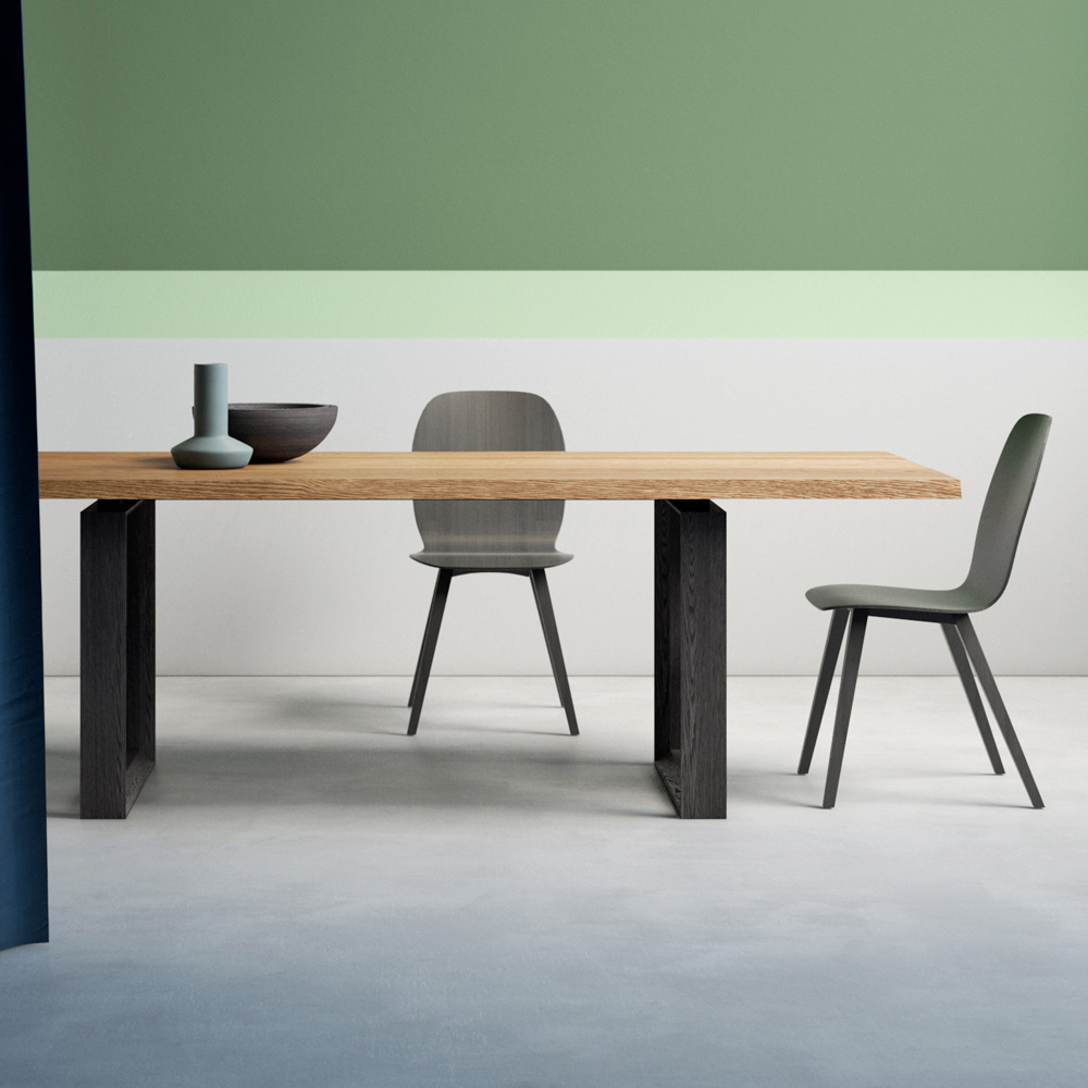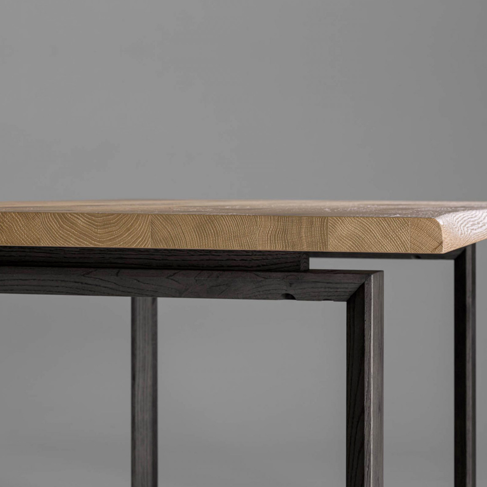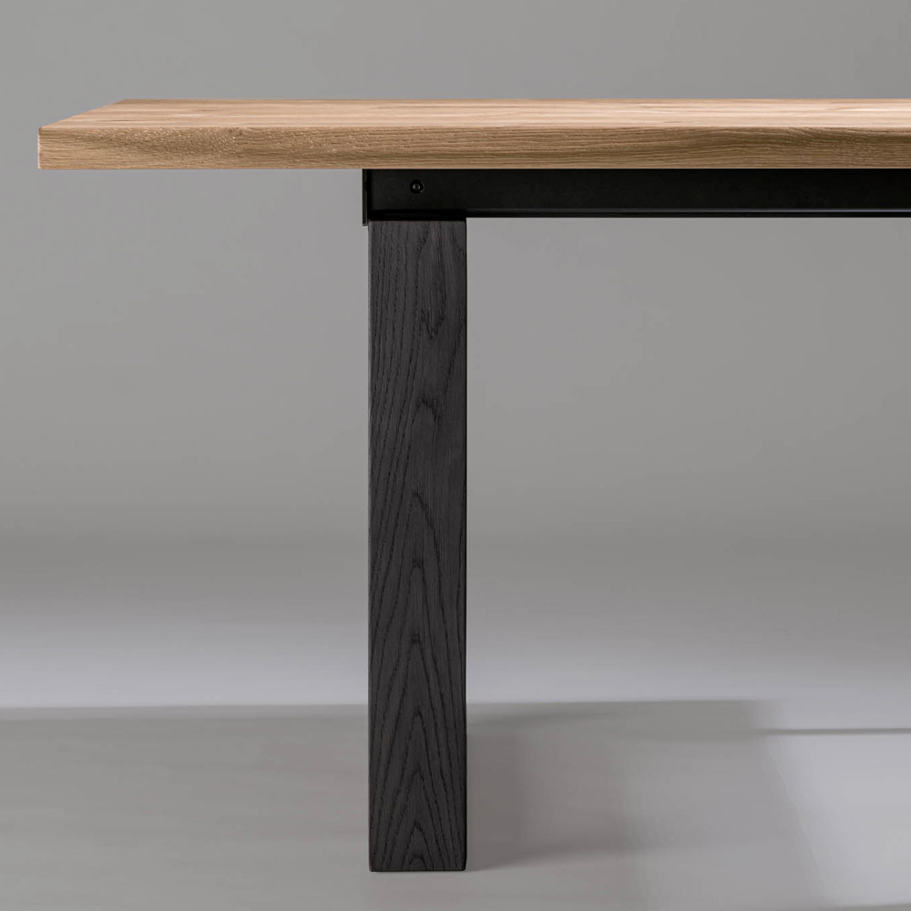 طاولة قابلة للتمديد، بسطح مشطوف من خشب البلوط الطبيعي على لوح خشب الحور، وحافة منزوعة اللحاء. أرجلها مكسوةومشطوفة من خشب البلوط المصمت المطلي بخشب البلوط المدخن. تتضمن امتدادين بطول ٥٠ سم لكل منهما، أحدهما أسفل الطاولة والآخر خارجي. صُممت الطاولة بأشكال مستقبلية، تُضفي على جوهرها لمسةً من الإشراق، وتمنحها خطوطًا ومنظورات مميزة. تُترجم متانة المواد إلى دافع إبداعي صاغته أيادٍ إيطالية ماهرة، لتحقيق أهداف نوعية وجمالية جديدة. يُصبح الأثاث وسيلةً لتحقيق مساحة شخصية مثالية.