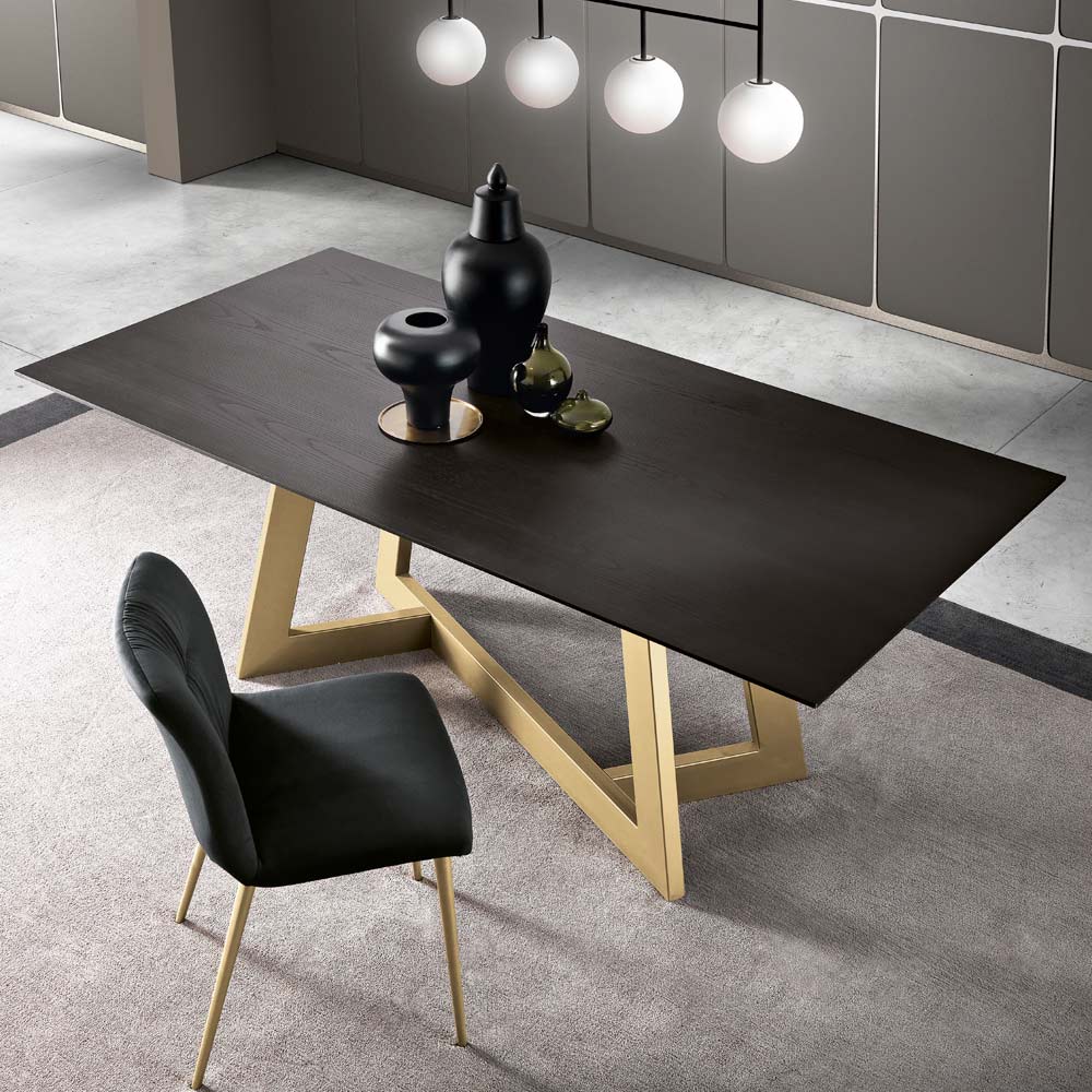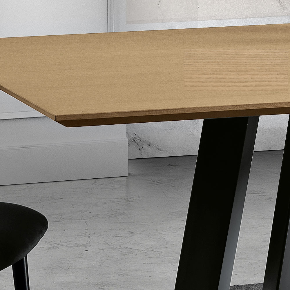 يدعم الهيكل أرجل معدنية تتشابك في أشكال هندسية جريئة، تجمع بين المتانة والتصميم الطليعي. يُضفي التباين بين دفء السطح الخشبي وطابع المعدن الصناعي توازنًا بصريًا مذهلاً، مما يجعل هذه القطعة مثالية لمجموعة واسعة من التصميمات الداخلية، من الكلاسيكية إلى المعاصرة.