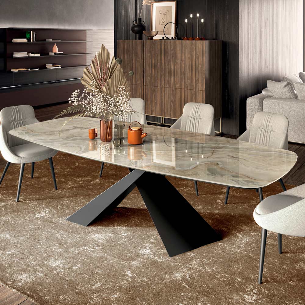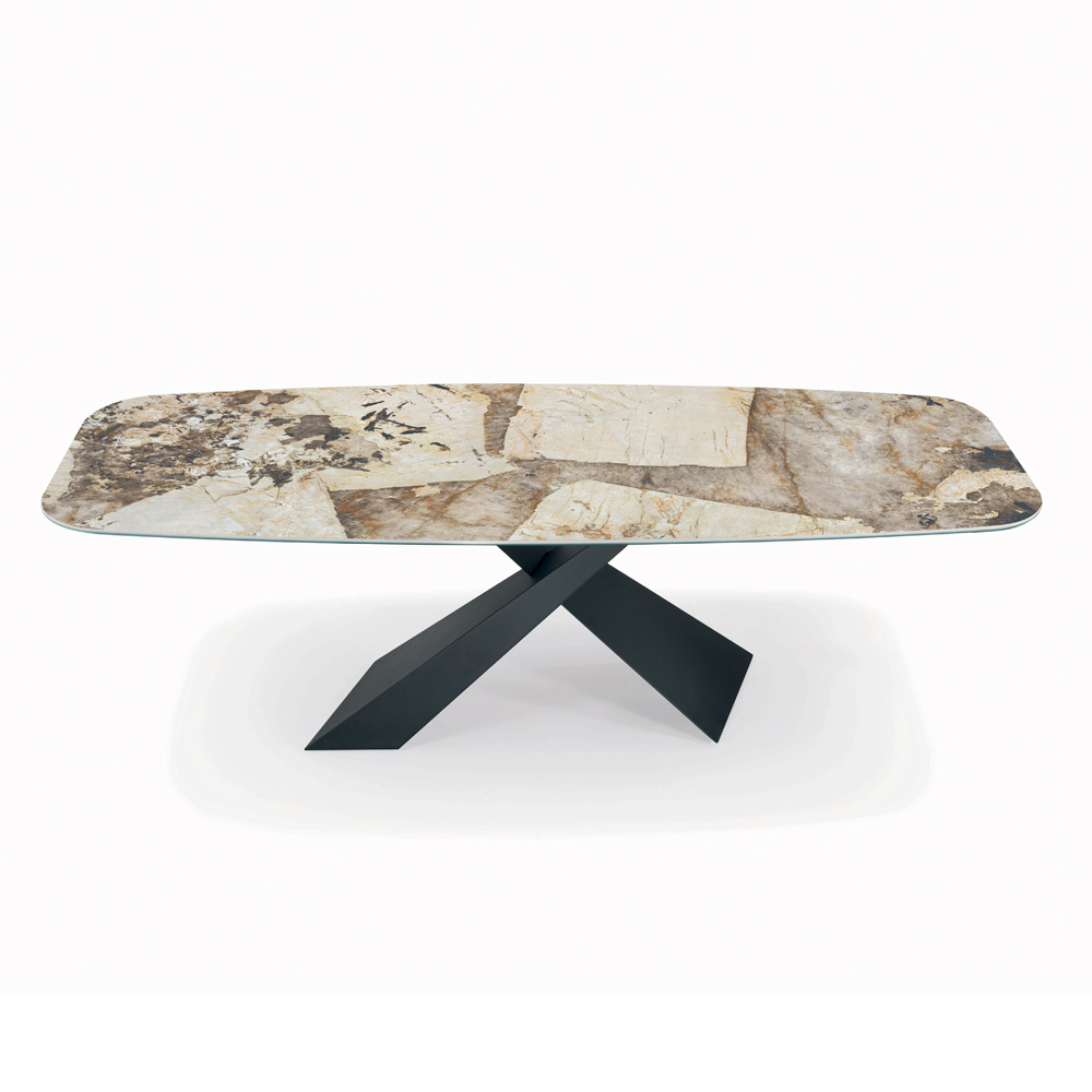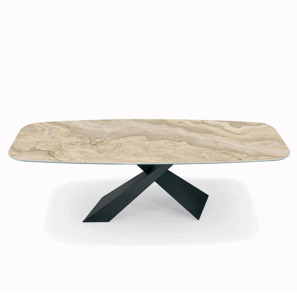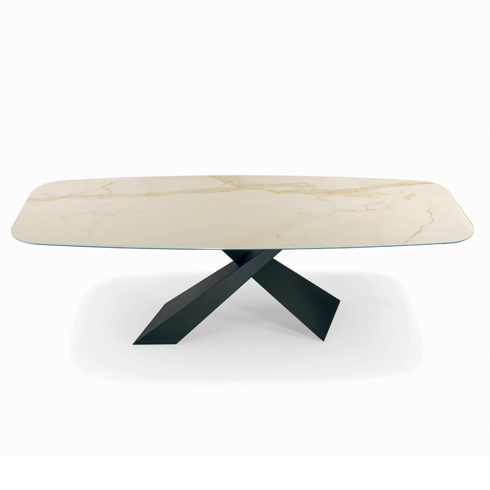 طاولة معيشة ثابتة على شكل برميل مع سطح من السيراميك وحافة مشطوفة بزاوية 45 درجة وقاعدة من الفولاذ المطلي باللون الأسود وأقدام قابلة للتعديل. شكل القاعدة المميز على شكل حرف X يضفي على الطاولة لمسةً فريدةً وراقيةً ، تُناسب تخصيصها وتكاملها مع أثاث أي بيئة يومية أو تعاقدية. تتميز هذه الطاولة بجودة موادها الممتازةودقة تصنيعها ، مما يضمن جميع وظائفها التي تُعرف بصنعها في إيطاليا.