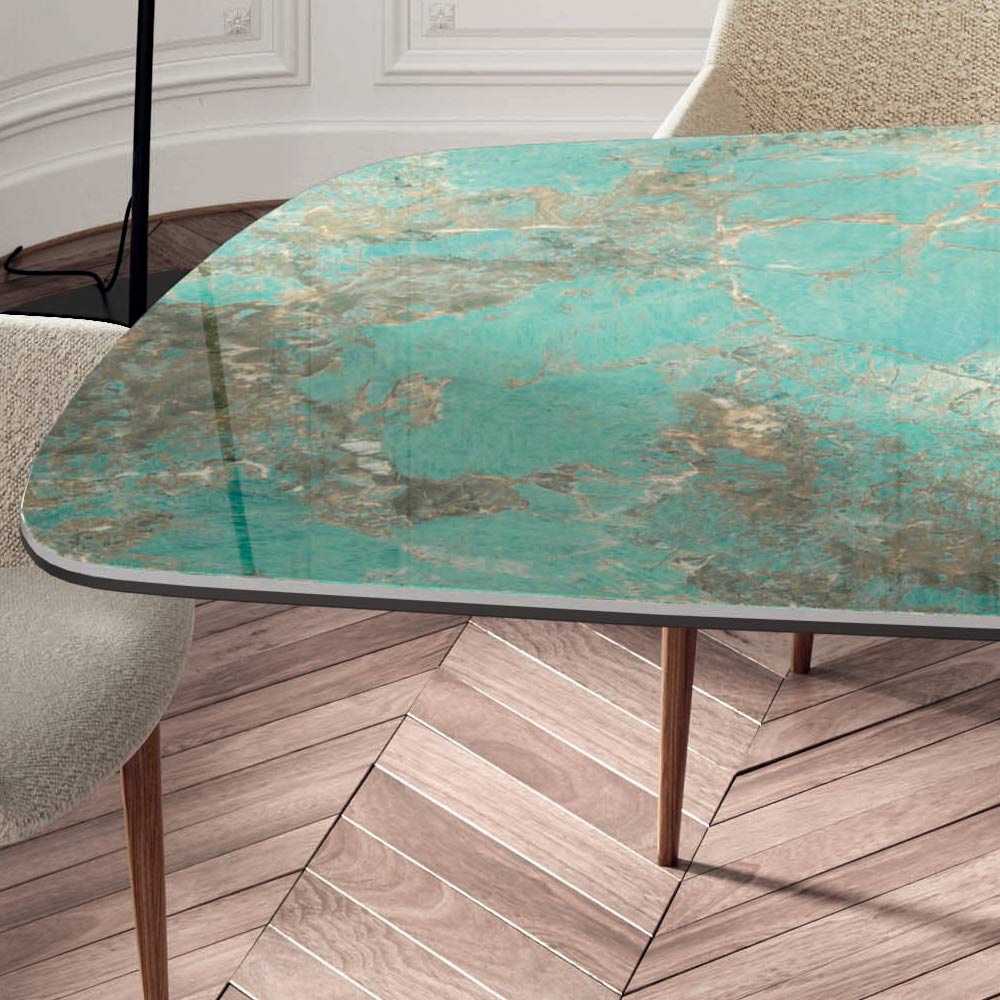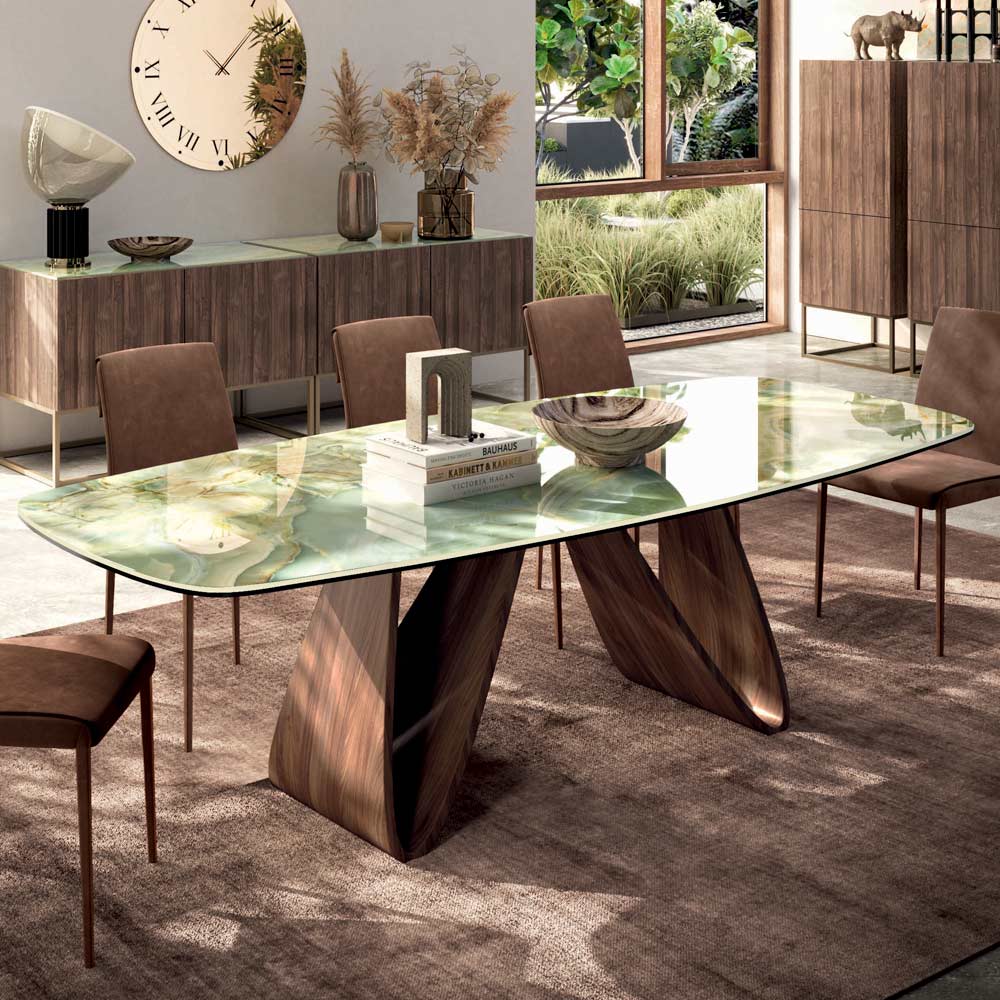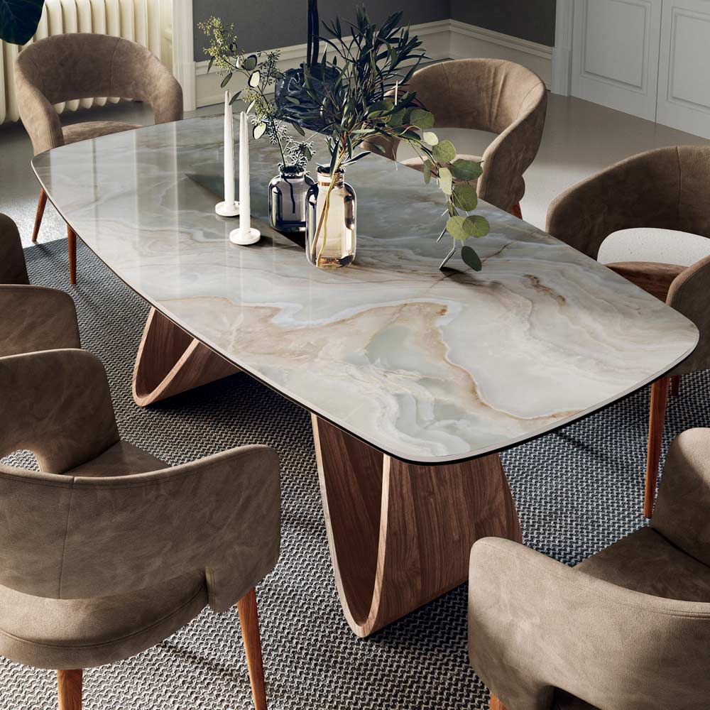 طاولة معيشة ثابتة على شكل برميل مع سطح من السيراميك وحافة مشطوفة بزاوية 45 درجة وقاعدة من خشب الجوز كاناليتو وأقدام قابلة للتعديل. بفضل شكل القاعدة والتشطيبات العلوية المتوفرة، تُضفي الطاولة لمسةً من الحركة والأناقة على أي بيئة يومية أو عملية. تضمن المواد المستخدمة الأداء العملي والجمال البصري، ما يجعلها منتجًا عمليًا وجميلًا في جميع المناسبات.
