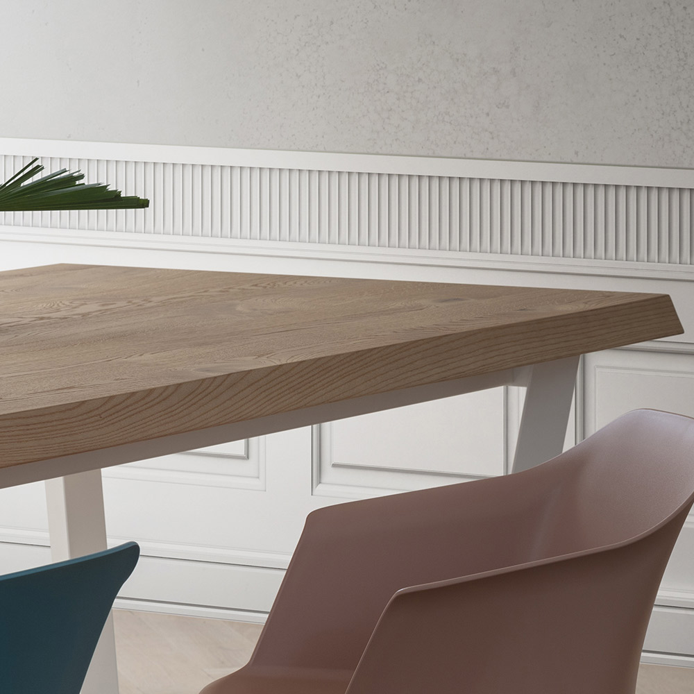 طاولة طعام مستطيلة ثابتة، مصنوعة في إيطاليا، بأرجل معدنية مطلية بمسحوق الإيبوكسي، بلون أبيض، وسطح خشبي منزوع القشرة بسمك 50 مم. قطعة أثاث تتميز بتصميم أنيق ونحتي ، يجمع بين مواد متنوعة وشغف الصنع.
