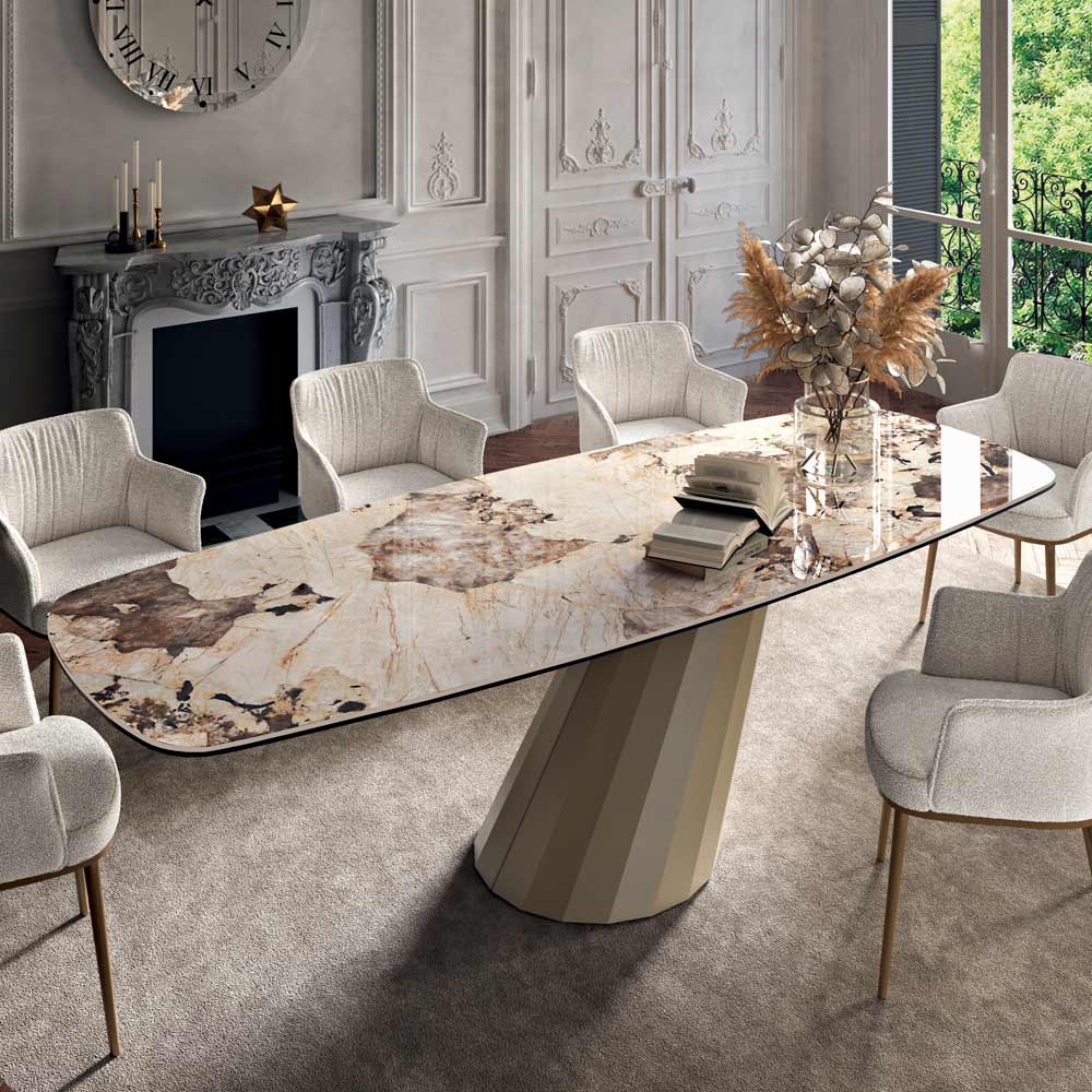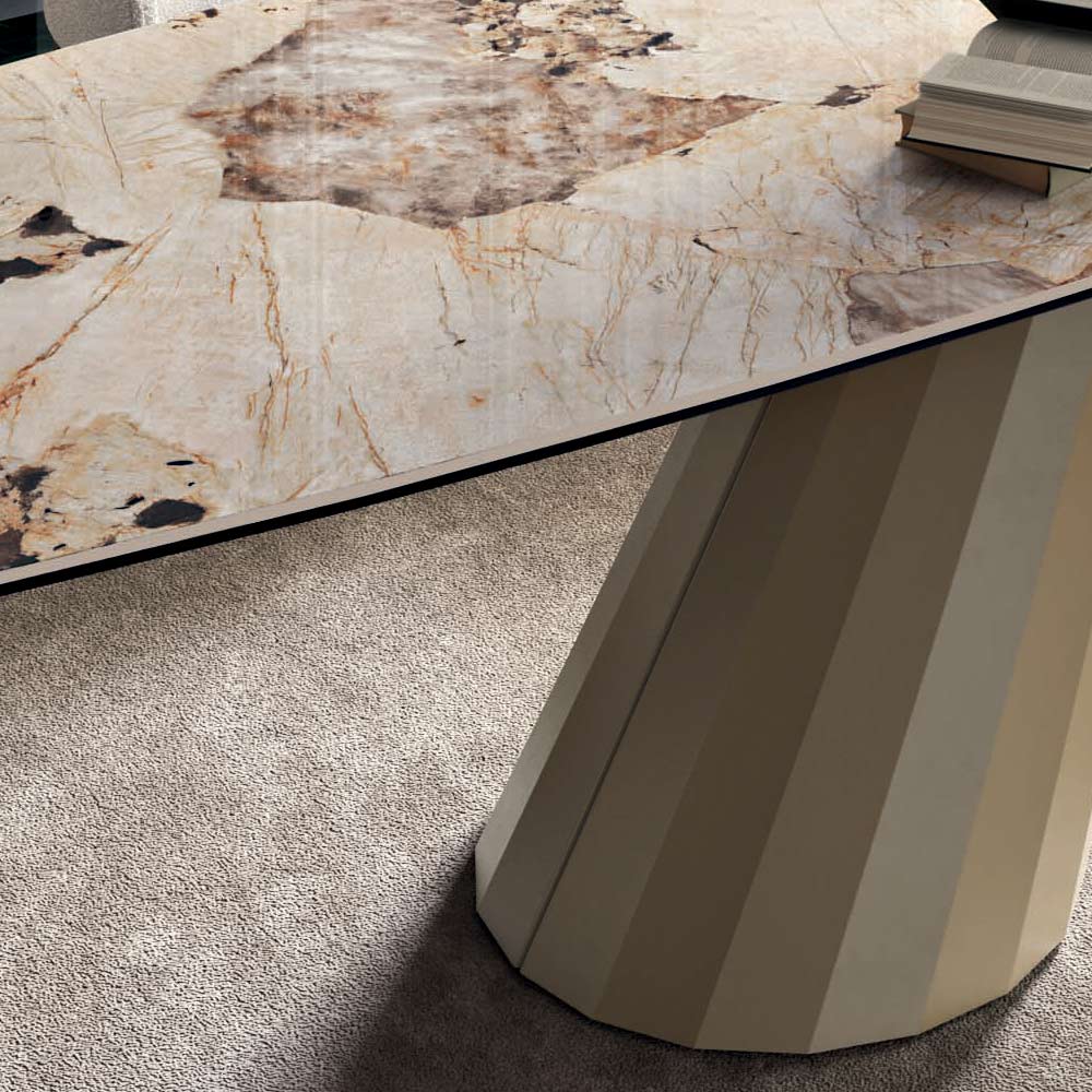 طاولة معيشة ثابتة على شكل برميل مع سطح من السيراميكوحافة مشطوفة بزاوية 45 درجة وقاعدة فولاذية مطلية بالشمبانيا وأقدام قابلة للتعديل صنع في إيطاليا. يُضفي هذا المنتج لمسةً من الأناقةعلى أي بيئة، ويصبح عنصرًا أساسيًا فيها . يُضفي تصميم القاعدة الأنيق، إلى جانب اللمسة النهائية للسطح الذي تختاره، لمسةً فريدةً على الطاولة، بتأثير بصري رائع يُضفي رقيًا وفخامةً على بيئات العمل اليومية. اختيار أجود الخاماتوالعناية بأدق التفاصيل يُنتج منتجًا بجودة ممتازة، صُنع في إيطاليا.