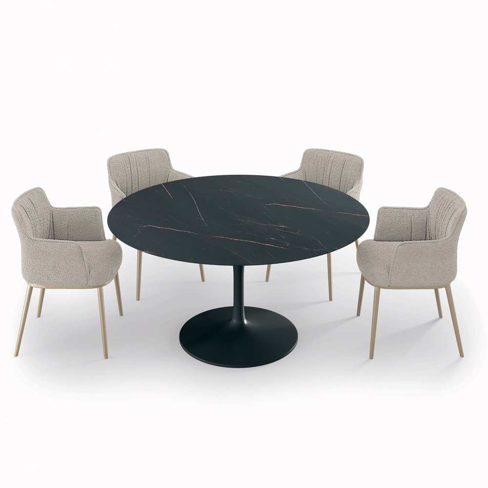 طاولة معيشة ثابتة مع سطح مغلف بالبلاستيك بلمسة نهائية غير لامعة، وحافة مشطوفة بزاوية 45 درجة ، وقاعدة من الألومنيوم المصبوب المطلي باللون الأسود اللامع. تُنفَّذ سلسلة الإنتاج، من التصميم إلى الإنتاج، وصولاً إلى مراقبة الجودة، بالكامل في إيطاليا ، وذلك لضمان والحفاظ على الطابع الإيطالي الأصيل للخبرة العملية وأهمية علامة "صنع في إيطاليا". يهدف هذا المنتج العصري، الذي يتميز بتصميمه العصري، بشكل أساسي إلى سهولة استخدامه يوميًا دون المساس بالتصميم.