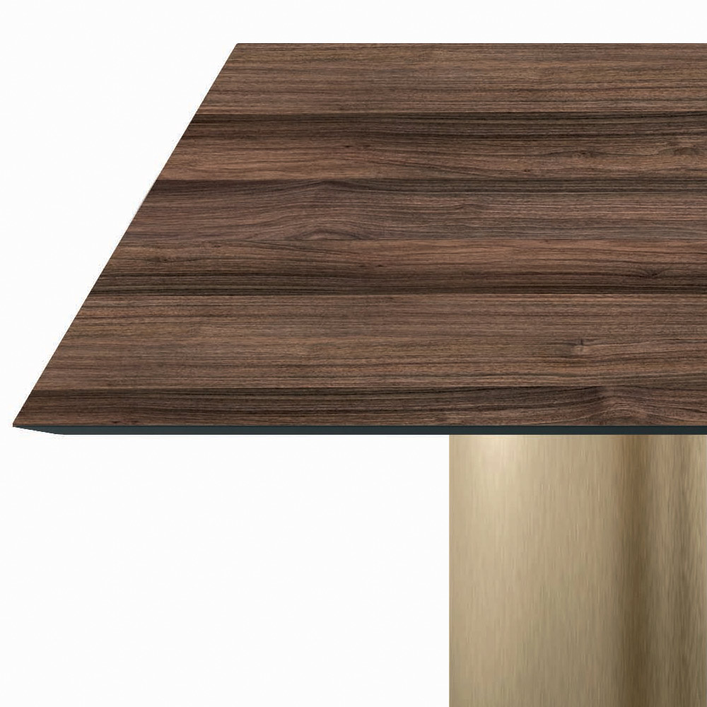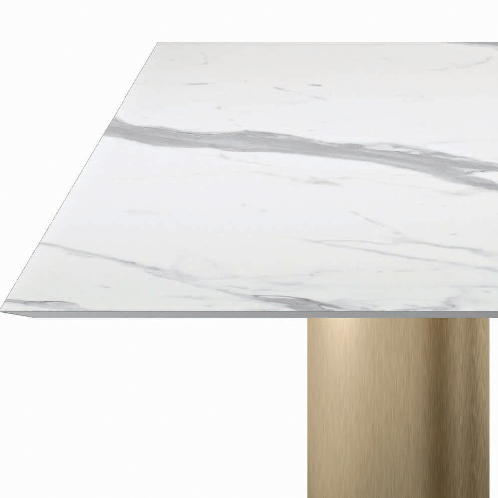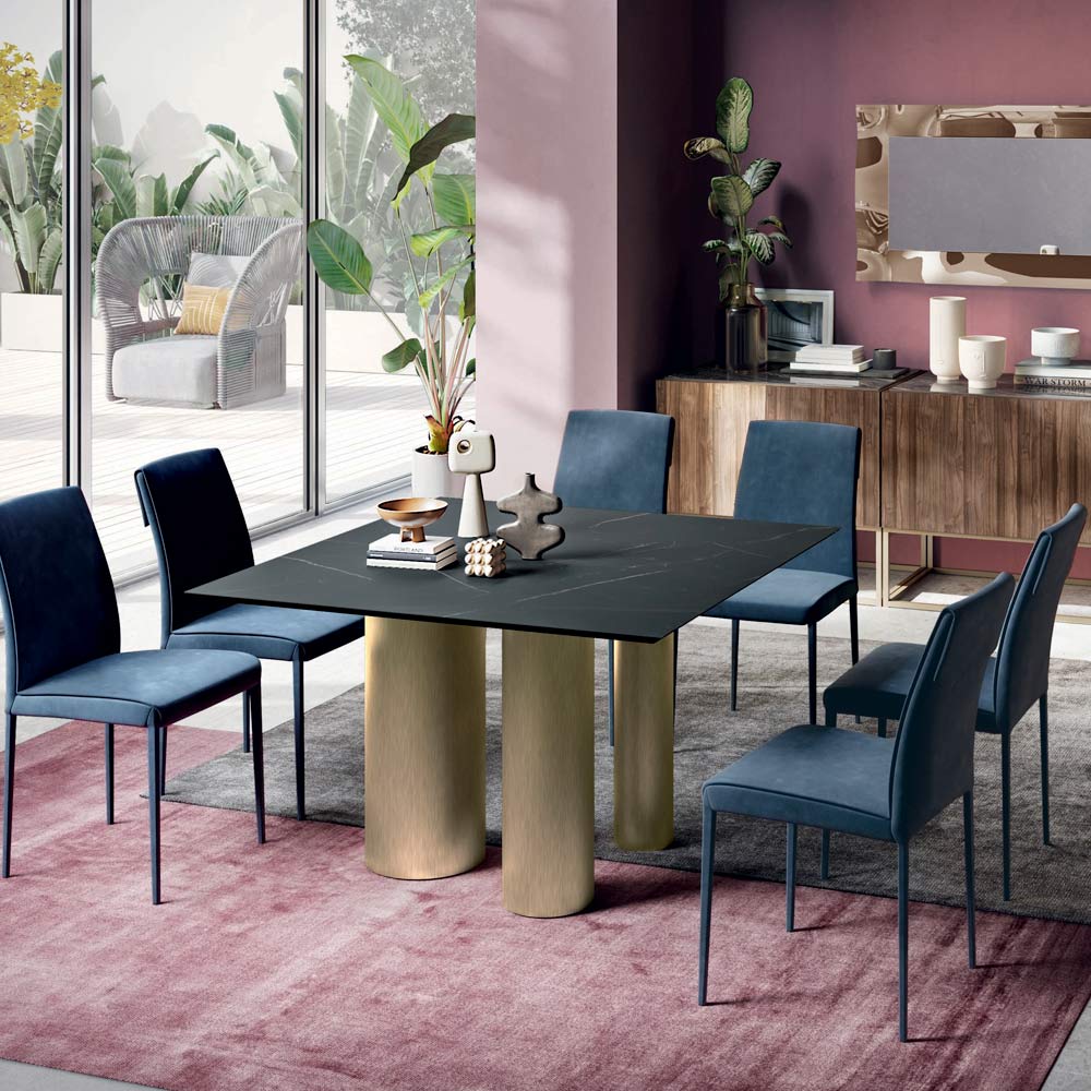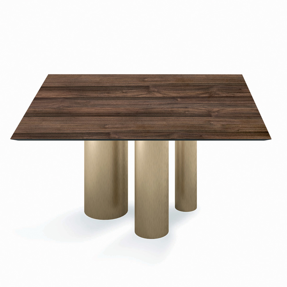طاولة معيشة ثابتة مربعة الشكل مع سطح من الصفائح المصفحة وحافة مشطوفة بزاوية 30 درجة وقاعدة من الفولاذ المطلي باللون الشمبانيا وأقدام قابلة للتعديل. ما يميز هذا المنتج هو قاعدته المكونة من ثلاث أسطوانات بأحجام مختلفة ، مما يمنحه أناقةً ورقيًا فريدين . تُكمل هذه الطاولة أي بيئة يومية أو تعاقدية وتُضفي عليها طابعًا شخصيًا، مُلبيةً بذلك احتياجات التصميم المتنوعة. صُنعت بالكامل في إيطاليا باختيار أجود الخامات مع الاهتمام بأدق التفاصيل.