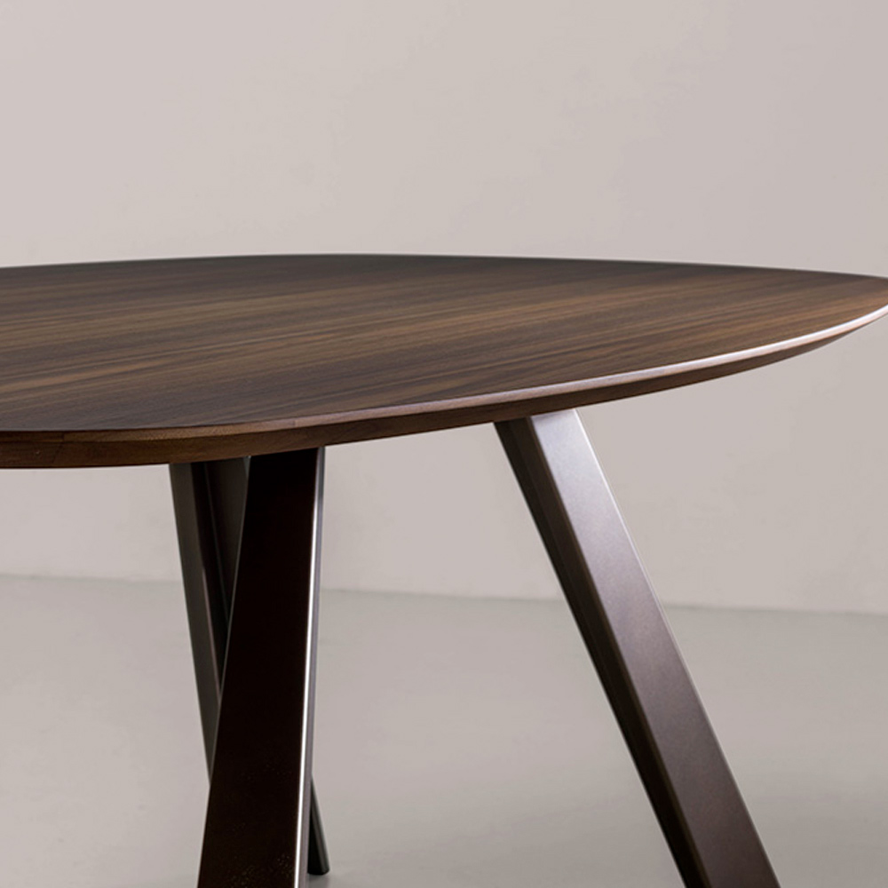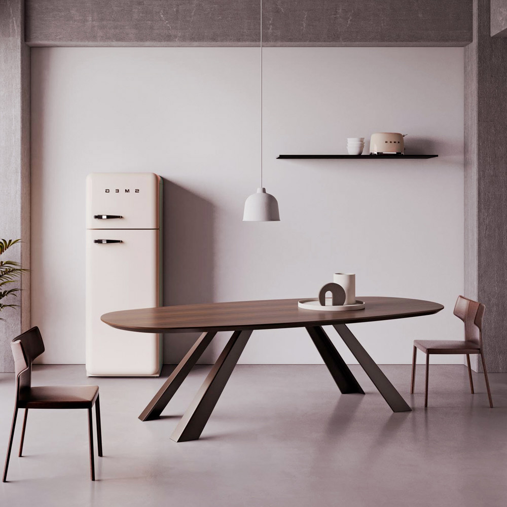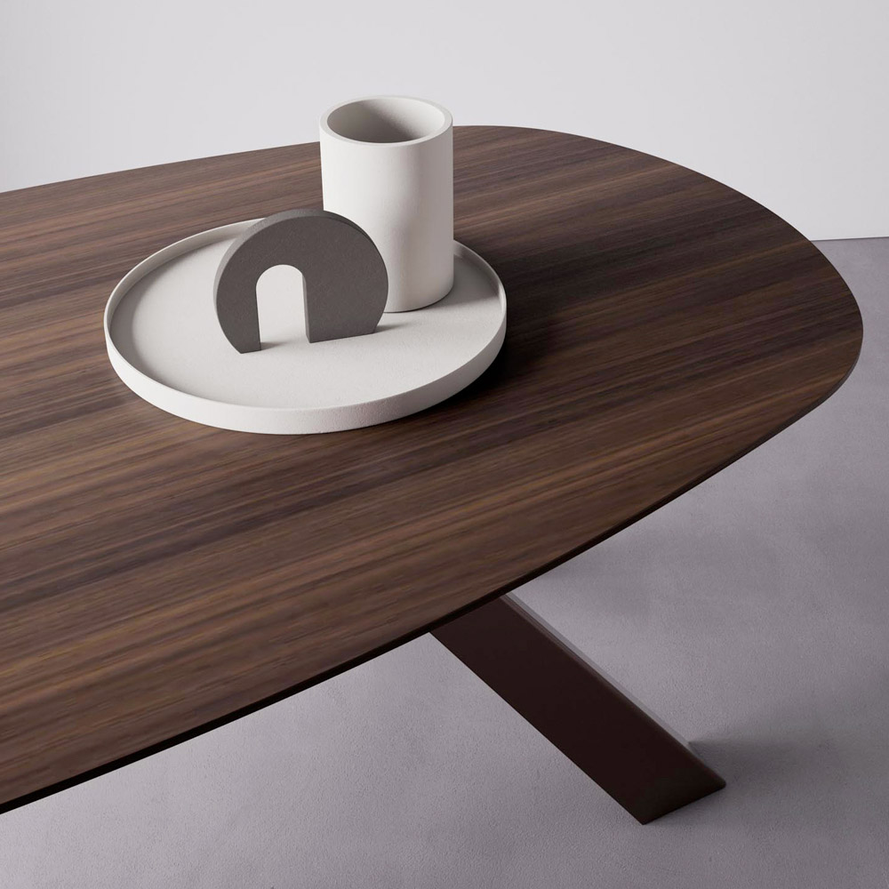 طاولة ثابتةبسطح بيضاوي مشطوف من خشب الأوكالبتوس، وأرجل من المعدن المطلي بطبقة برونزية.أبعادها: الارتفاع ٧٧ سم، السُمك ٣ سم. صُممت الطاولة بأشكال مستقبلية، تُضفي على جوهرها لمسةً من الإشراق، وتمنحها خطوطًا ومنظورات مميزة. تُترجم متانة المواد إلى دافع إبداعي صاغته أيادٍ إيطالية ماهرة، لتحقيق أهداف نوعية وجمالية جديدة. يُصبح الأثاث وسيلةً لتحقيق مساحة شخصية مثالية.