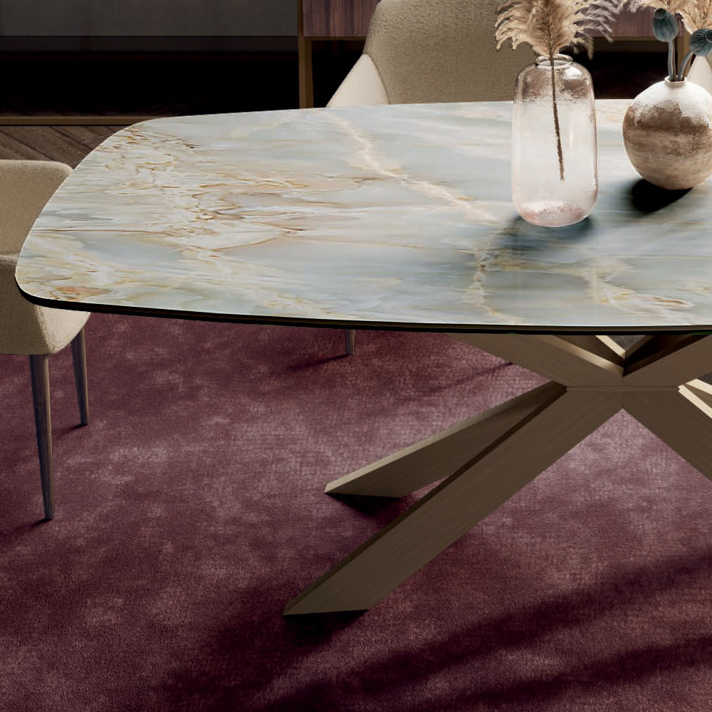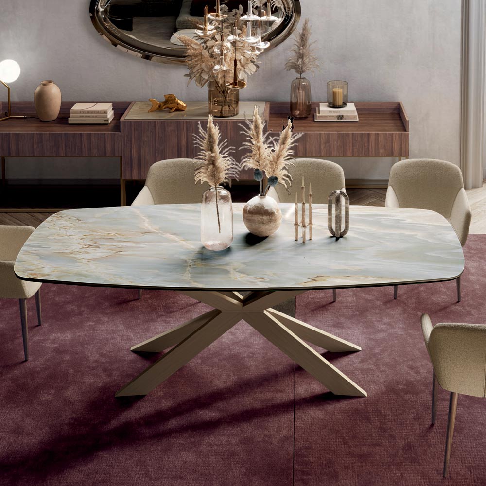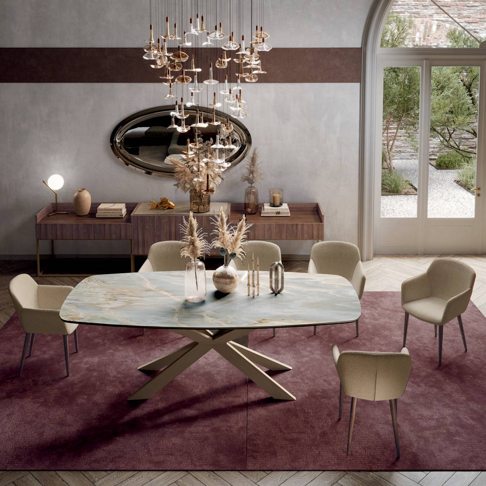 طاولة معيشة ثابتة على شكل برميل مع سطح سيراميك بلمسة نهائية من العقيق الفضي اللامع، وحافة مشطوفة بزاوية 45 درجة ، وقاعدة فولاذية مطلية بالشمبانيا مع أقدام قابلة للتعديل. يتجلى في هذا المنتج براعة وجودة الحرفيين الإيطاليين ، حيث تم اختيار أجود الموادبعناية فائقة . أردنا الجمع بين الأسلوب العصري والعملية لابتكار طاولة جميلة المظهر، وسهلة الاستخدام في مختلف المناسبات.