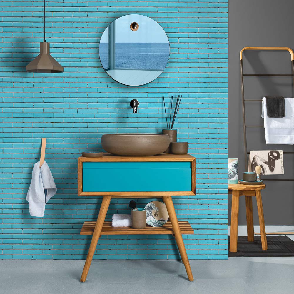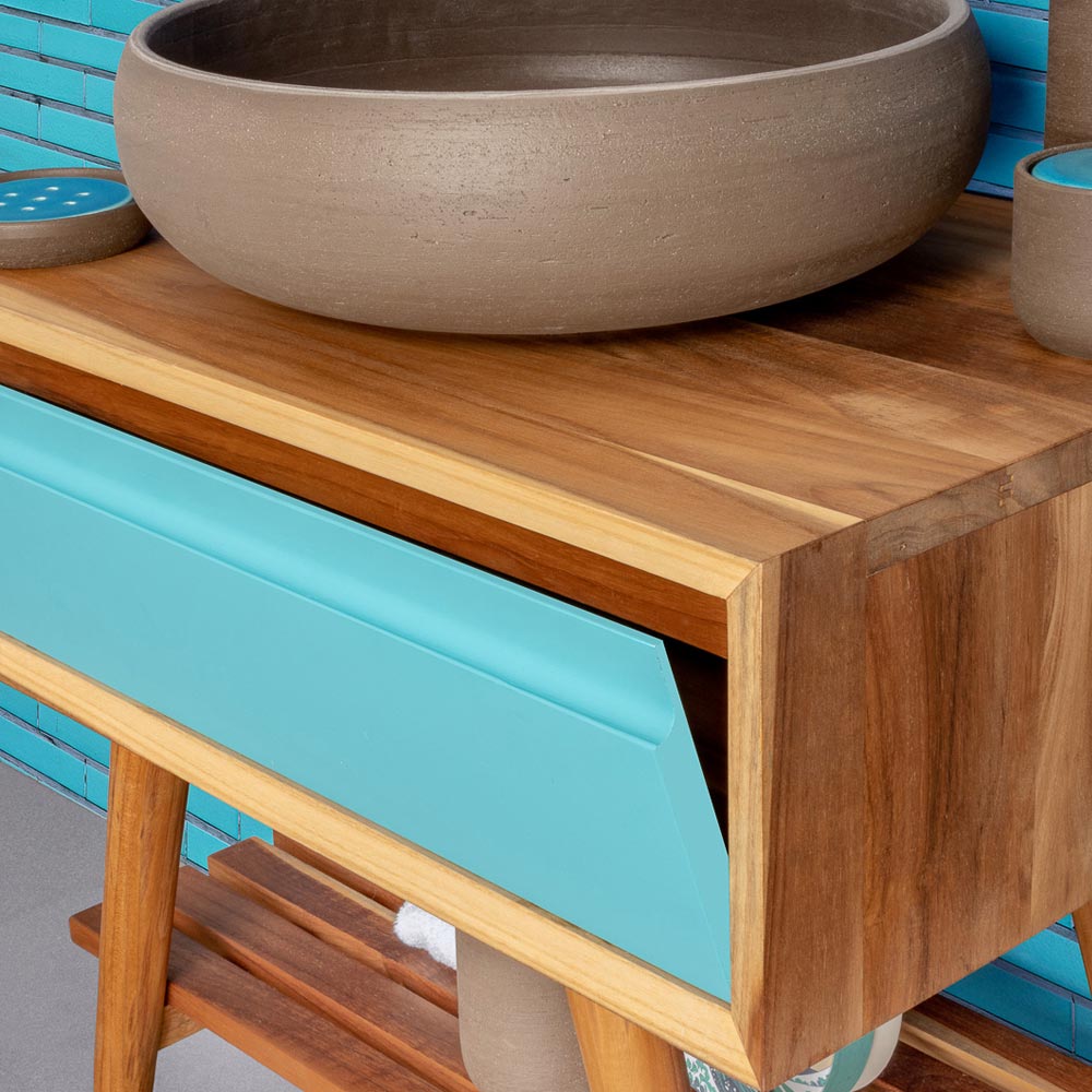 خزانة حمام أرضية مصنوعة من خشب الساج الطبيعيالمُجدَّد، مع درج بغطاء، بلون الماهوجنيالأزرق . لون يُجسّد الهدوء والسكينة المرتبطين بعناصر الطبيعة كالماء والهواء، مُضفيًا عليها تأثيرات مُريحة ومشاعر تُجسّد سحر الطبيعة المُسيطر. يتميز هيكلها بأشكال بسيطةومساحات عملية ، مثالية لتنظيم مساحة الحمام بشكل أنيق وعملي ، لنتيجة أصليةبطابع عصري قوي .