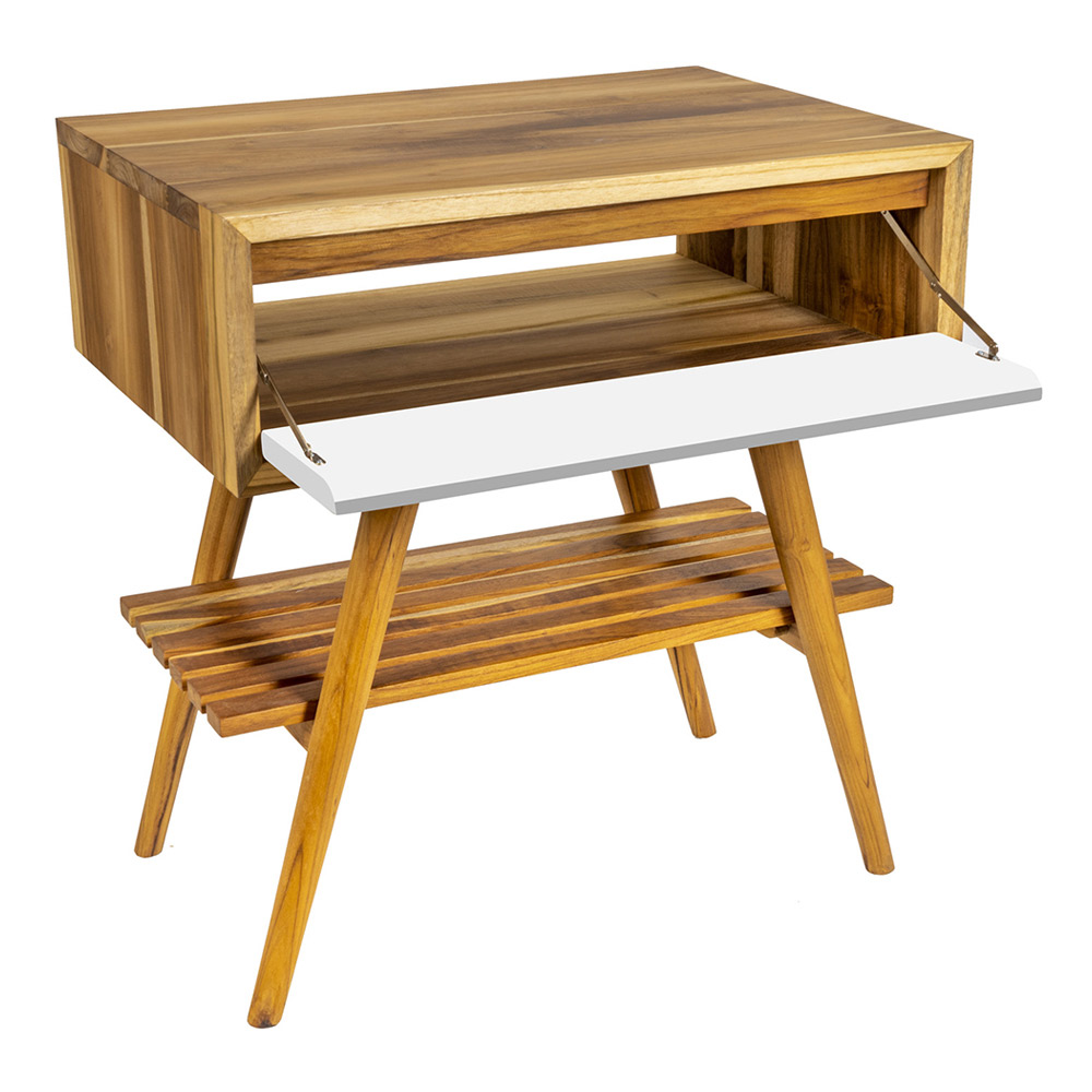 خزانة حمام مثبتة على الأرض مصنوعة من خشب الساج مع درج أبيض.