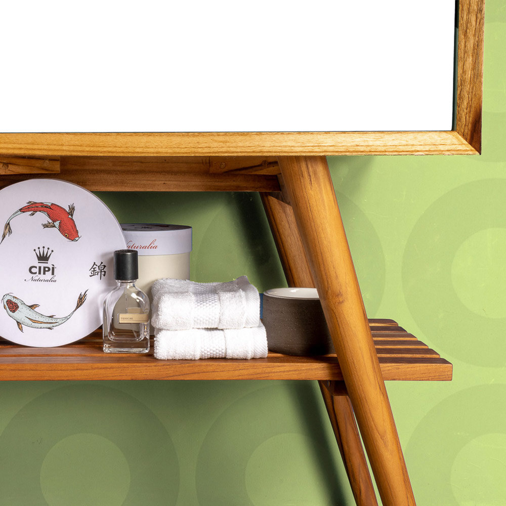خزانةحمام قائمة بذاتها، بهيكل من خشب الساج الطبيعي المُعاد تدويره، ودرج بغطاء، من خشب الماهوجنيالأبيض ، لون يُجسّد مفهوم السلام والحرية والنقاء وبداية جديدة، يُذكّرنا ببياض الثلج وصفاء الطبيعة في أنقى صورها. يتميز هيكلها بأشكال بسيطةومساحات عملية مثالية لتنظيم مساحة الحمام بشكل أنيق وعملي ، لنتيجة أصليةبطابع عصري قوي .