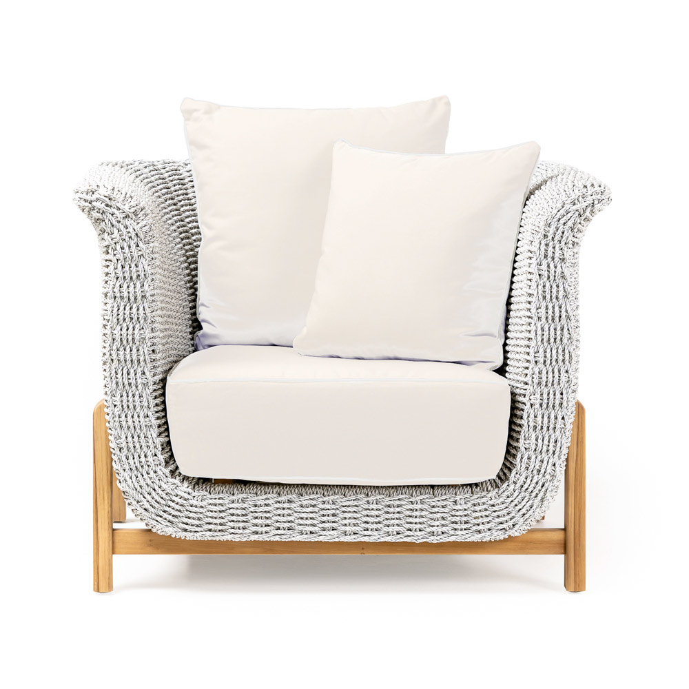 هذا الكرسي الخارجي مصنوع من هيكل داخلي من الألومنيوم المطلي بمسحوق الإيبوكسي، وقاعدة من خشب الساج ، وحبل VRO منسوج يدويًا. مجهزة بمقعد ووسائد ظهر من القماش المقاوم للماء باللون الرمادي هافانا .