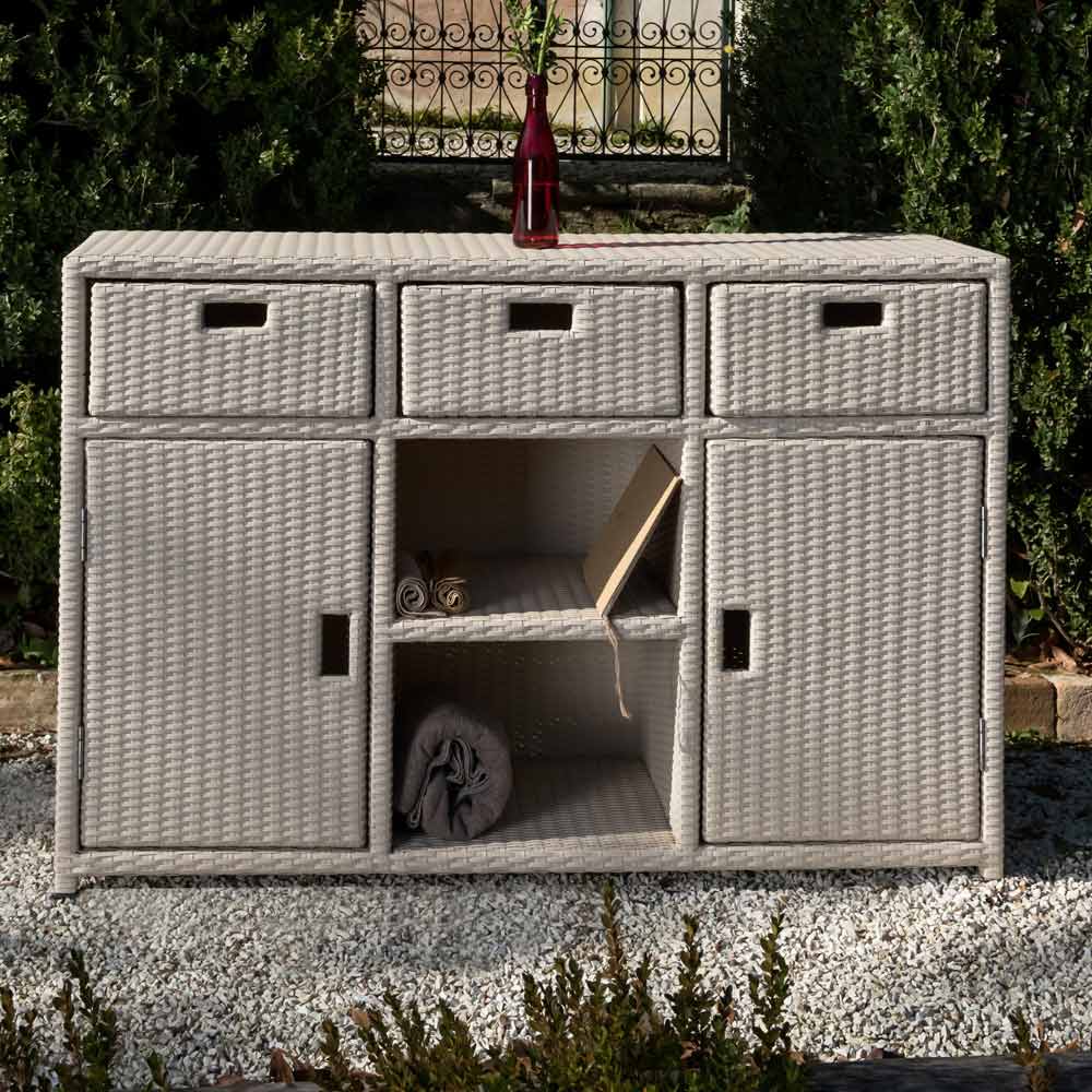 خزانة خارجية بإطار أنبوبي من الألومنيوم مغطى بنسيجبولي راتان . خزانة خدمة أنيقة مثالية لتخزين الوسائد والمناشف والأواني وأي ملحقات أخرى.