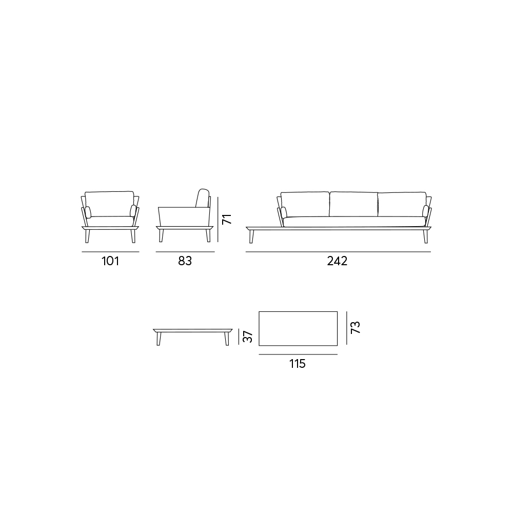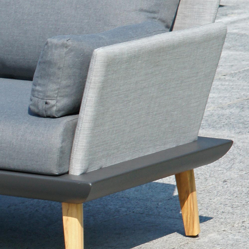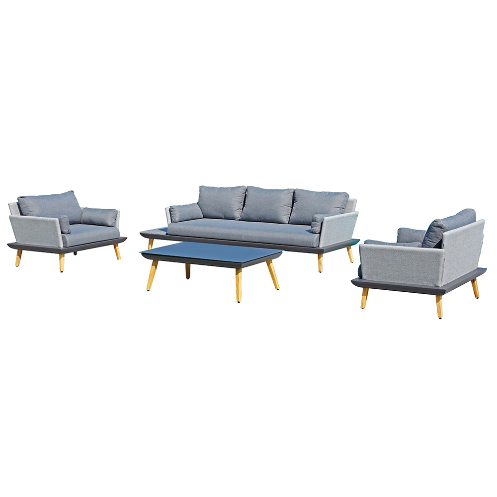 صالة خارجية تتكون من كرسيين بذراعين وأريكة بثلاثة مقاعد، مزودة بطاولة جانبية عملية بسطح من خشب الراتنج مغطى بقماش تيكستيلين رمادي فاتح ، وهيكل من الألومنيوم بلون رمادي أنثراسيت ، وأرجل من الألومنيوم بتأثير الخشب، مع وسائد بوليستر رمادية قابلة للإزالة. كما تتضمن المجموعة طاولة قهوة بسطح من الزجاج المقسّى المصقول وهيكل من الألومنيوم بنفس لون باقي عناصر غرفة المعيشة.