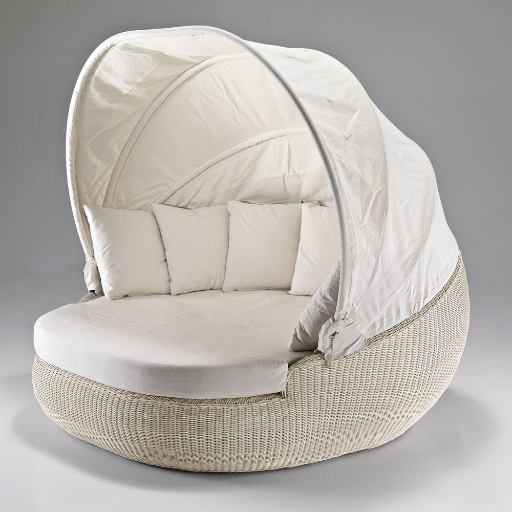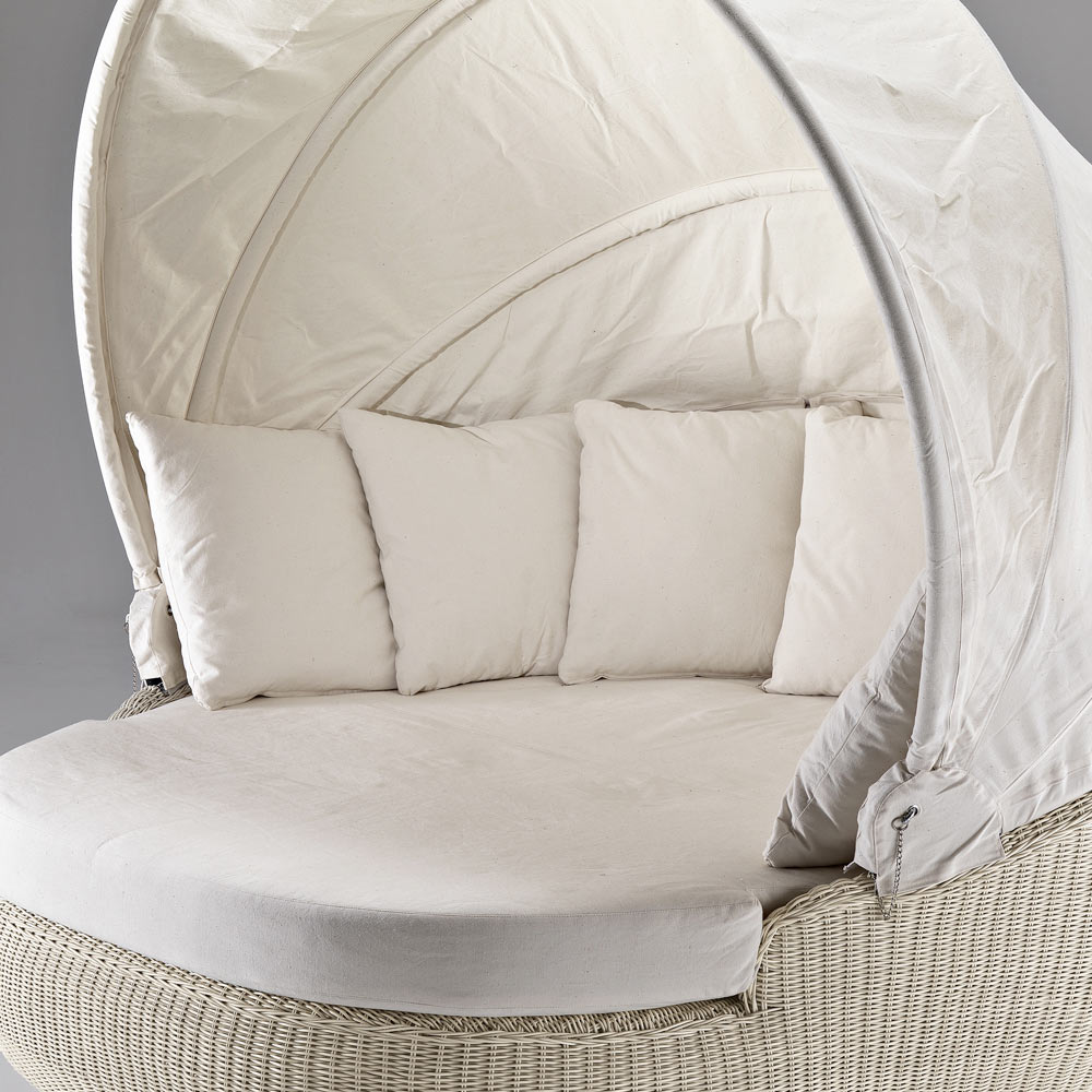 يتميز هذا الكرسي بتصميمه الدائري ونسيجه الكامل. تتناغم أحجامه الدائرية والمتعرجة بشكل مثالي مع المقعد الكبير الذي يتيح لك الاستمتاع باسترخاء مثالي. غطاء الرأس القابل للفتح والإغلاق يجعله مميزًا وعمليًا، إذ يتيح لك الاستمتاع بأشعة الشمس والظل في أشد أوقات اليوم حرارة.