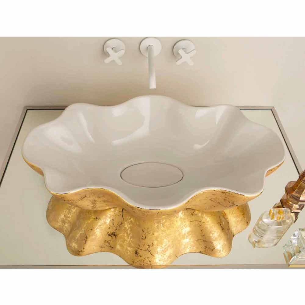 حوض غسيل بتصميم سطح الطاولة مصنوع من السيراميك الأبيض والذهبي من إنتاج Cubo في إيطاليا إن البحر والأشكال التي ينتجها موجودة في التوازن الجمالي الصحيح. تتواجد الإيماءة العضوية في المحيط، وتذكرنا بنجمة البحر. يمكن تخصيص حوض الغسيل هذا عن طريق الاختيار بين التشطيبات والديكورات المختلفة: لطلب معلومات و / أو عرض أسعار شخصي، اكتب إلى clienti@viadurini.it.