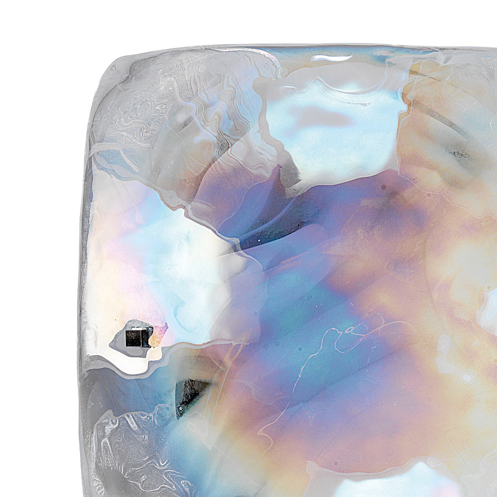 عمل فني صغير ذو جمالية مثيرة للاهتمام مصنوع من الزجاج الأبيض المخطط مع زخرفة القزحية (تأثير عرق اللؤلؤ) الذي يمنح البيئة لمسة من الأناقة الراقية بفضل الملمس الخاص والتأثير البصري غير المسبوق الذي يخلقه الزجاج للحصول على نتيجة فريدة من نوعها مع شخصية عظيمة.