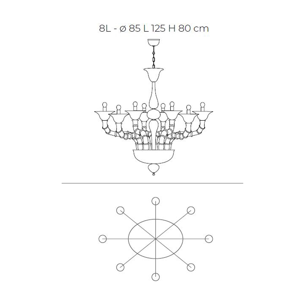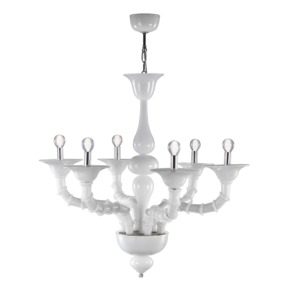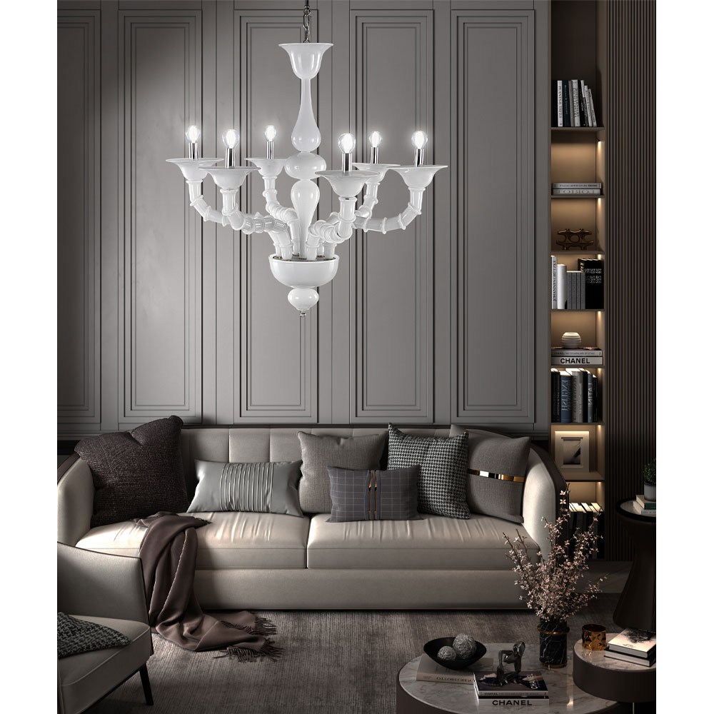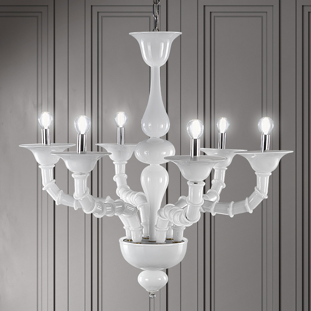 عمل فني يتميز ببراعة التفاصيل الثمينة المصنوعة من زجاج ريزونيكو الأبيض المنفوخ يدويًا، والمُصممة لتُكمل مساحات واسعة من المنزل، كغرف الطعام والمعيشة، مُضفيةً حيويةً على إضاءة عالية الجودة ذات طابعٍ آسر. يُصبح طول الأذرع ممكنًا بفضل تقنية "بوسول" الخاصة، والتي تعتمد على تركيب عدة قطع زجاجية معًا، مما يُظهر براعةً فنيةً فائقة .