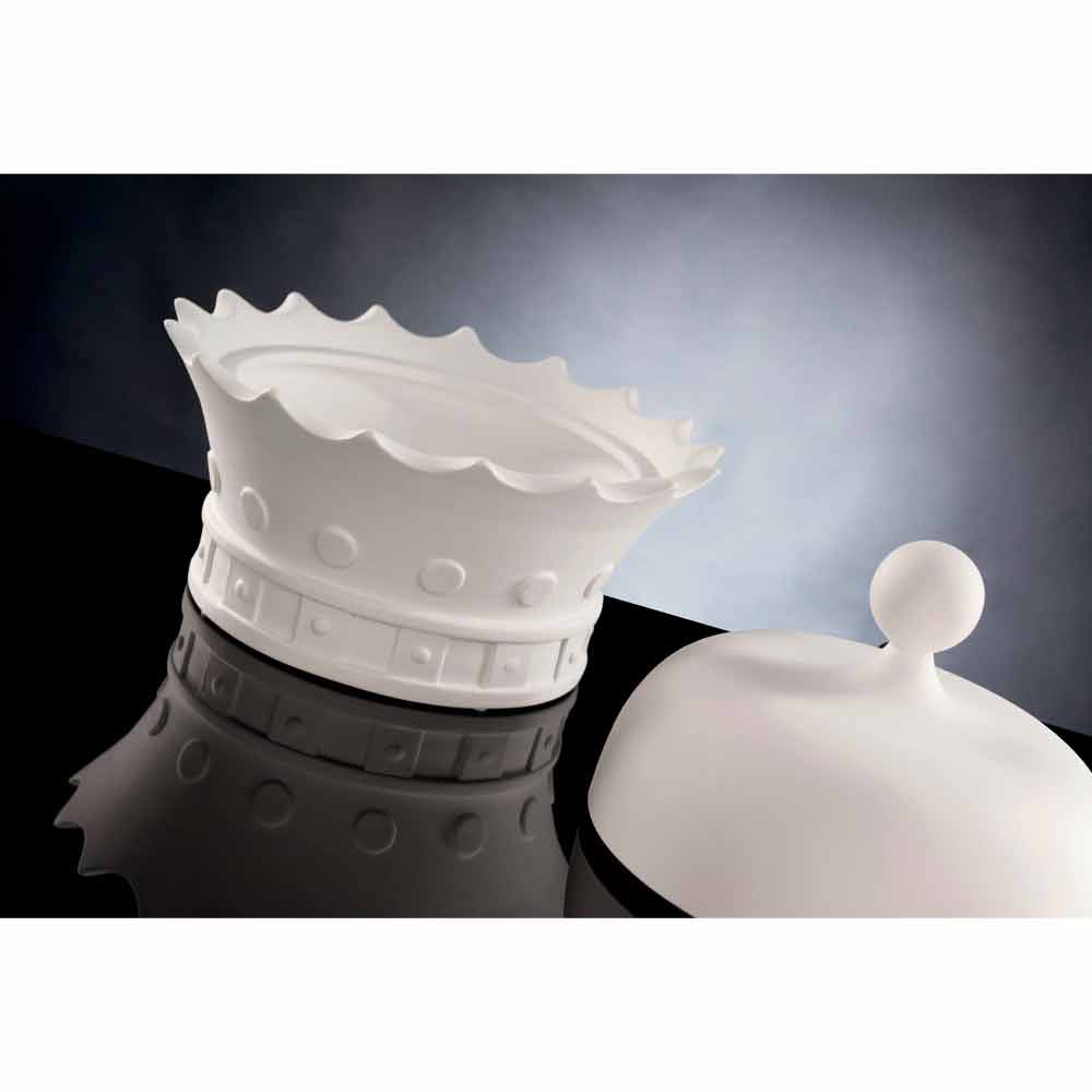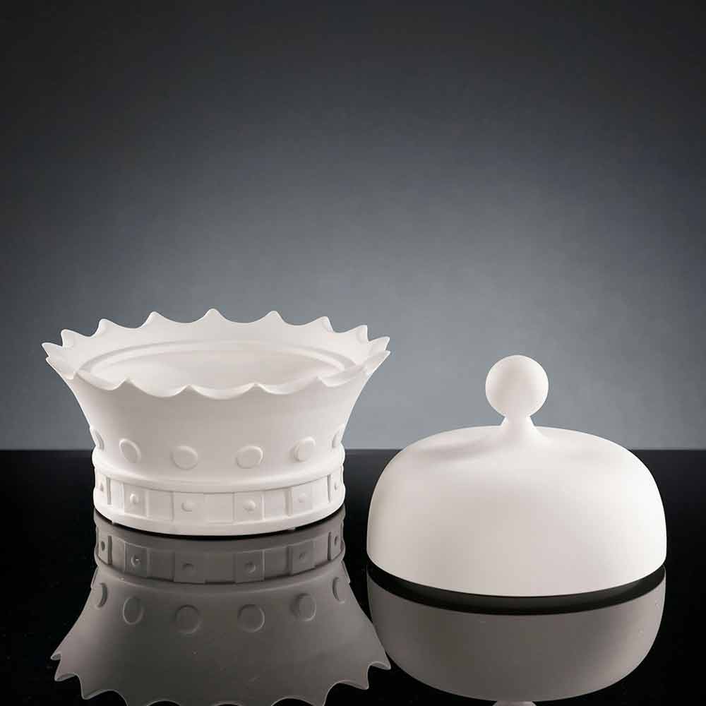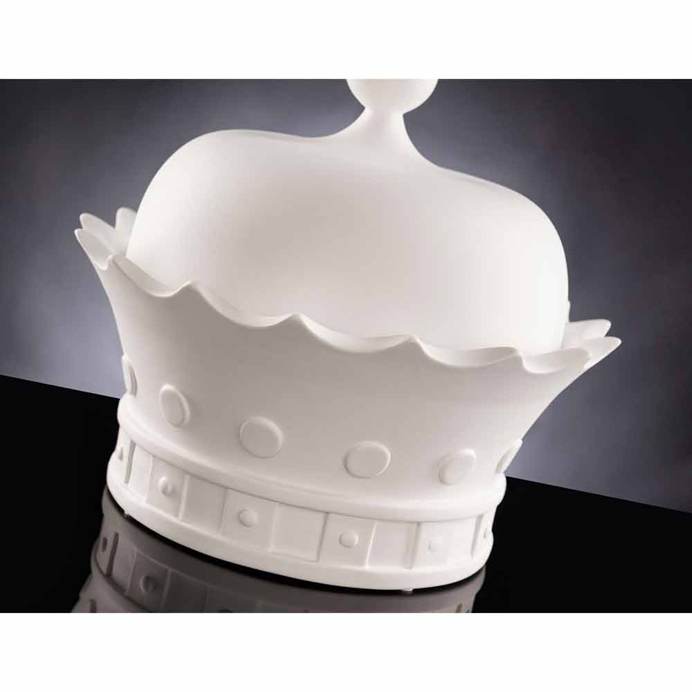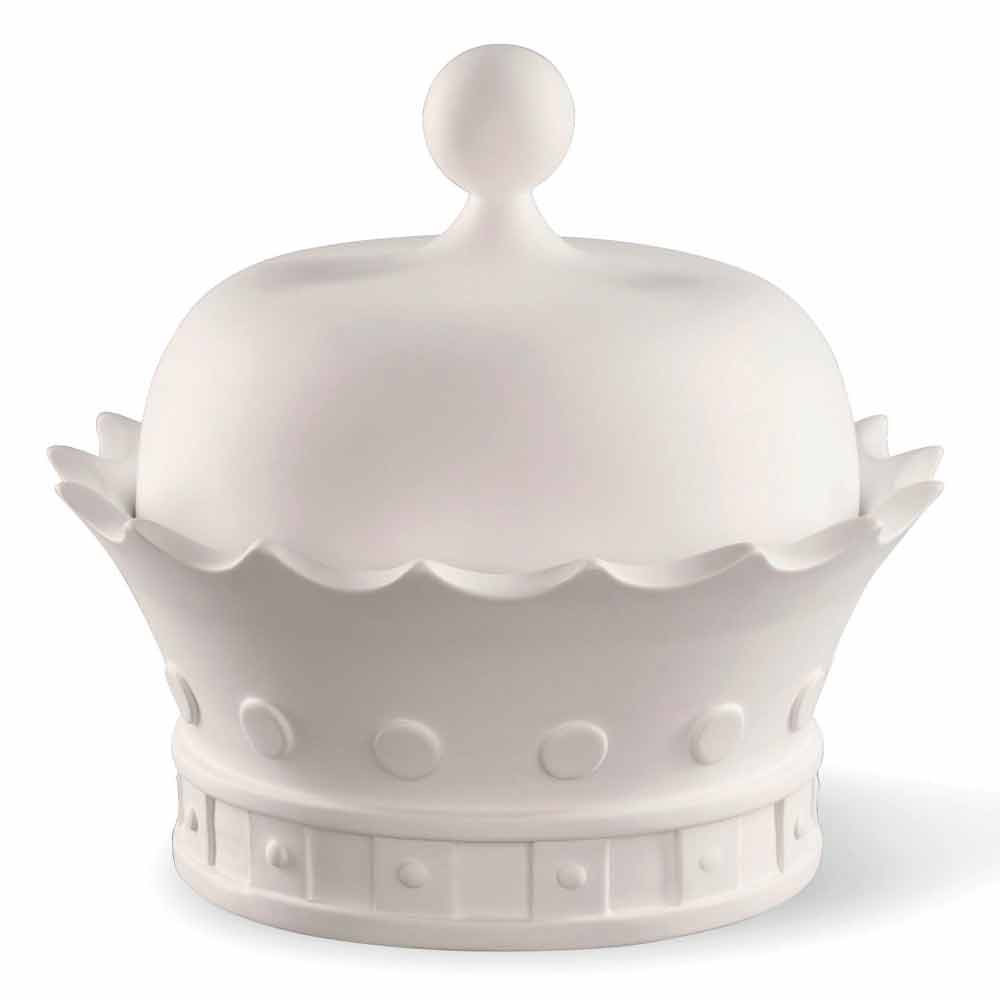 تمثال مزخرف على شكل تاج ملكي بفتحة، مصنوع في إيطاليا من السيراميك الأبيض اليدوي. قطعة فنية فريدة وأنيقة، تُكمل في الوقت نفسه ديكورات المنزل المحيطة، مُضفيةً تناغمًا رائعًا يُجسّد الحداثة والتصميم . شكله الأصلي والمبتكر مثالي لمن يُحبّون إثراء مساحاتهم المنزلية بعناصر ذات طابع أصيل وفريد، مع توفير مساحة صغيرة لتنظيم الأغراض بفضل الحجرة العملية أسفل الغطاء.
