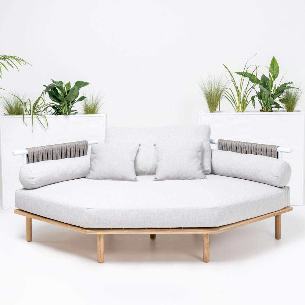 أريكة زاوية سداسية الشكل للحديقة مصنوعة من خشب الساج، ومساند ظهر من الألومنيوم ومنسوجة من حبل من مادة الأوليفين/البولي بروبيلين ووسادة