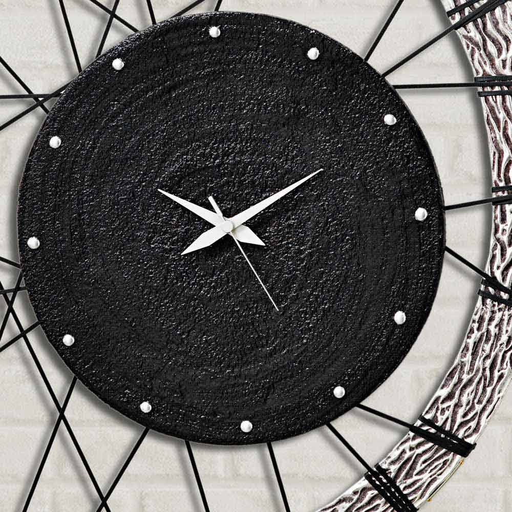 ساعة حائط أمالفي بتصميم عصري من Viadurini Decor. القطر: 70 سم (الحجم 70 × 70 سم) الساعة على لوحة دائرية مرتفعة ومثبتة على حبال مشدودة. إطار من أوراق الفضة على نسيج مزخرف يدويًا مع عنصر مركزي معلق على الحبال، لمسة نهائية لامعة.