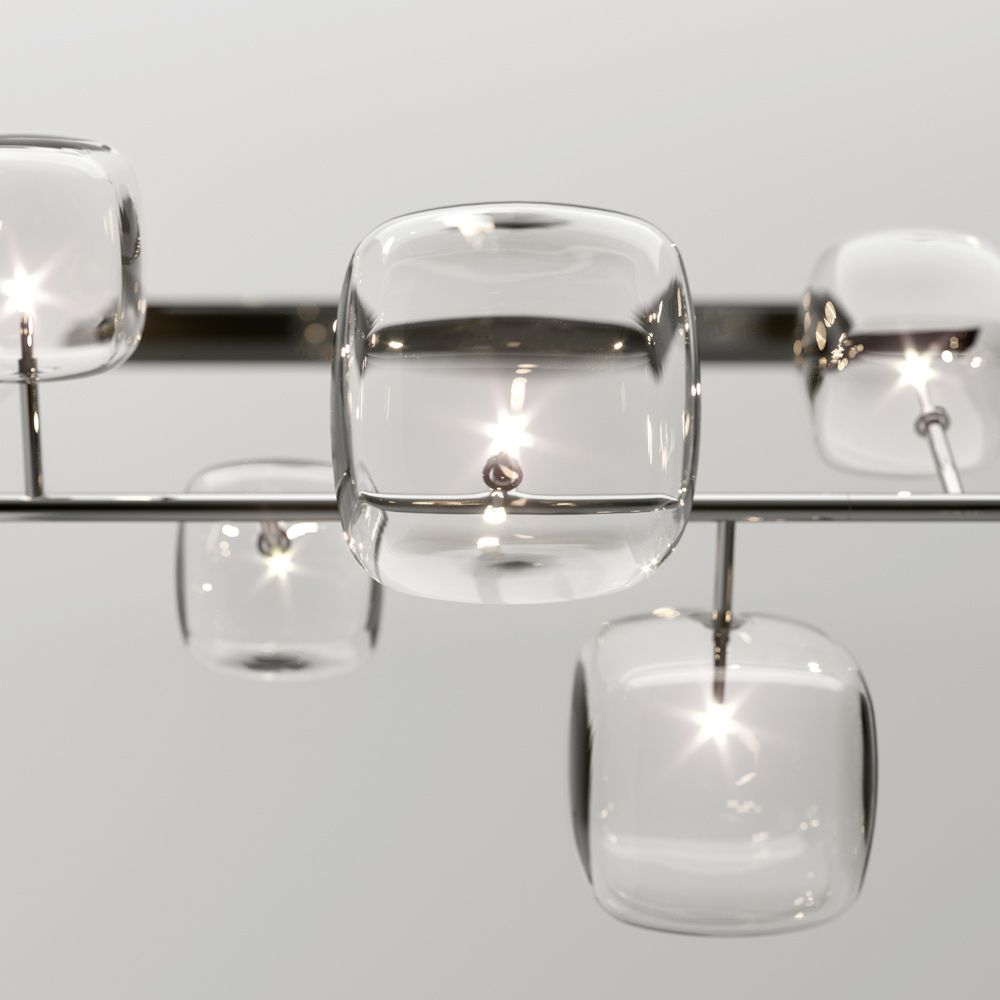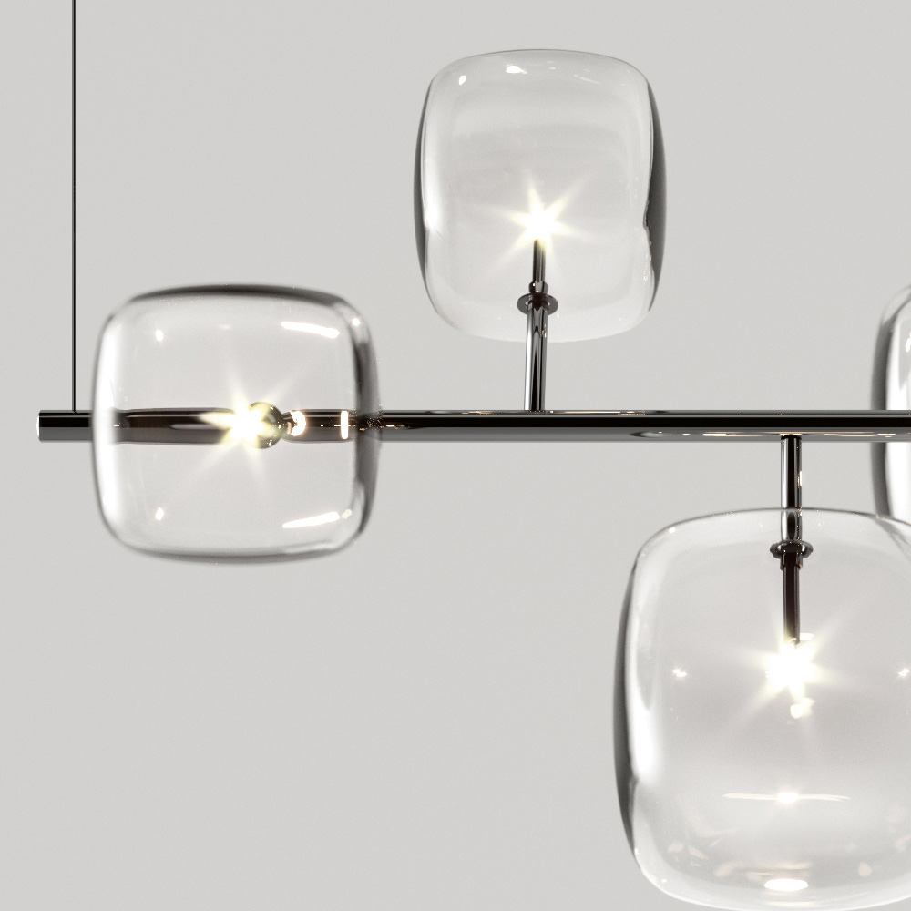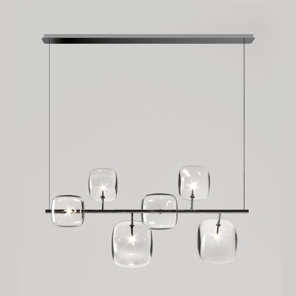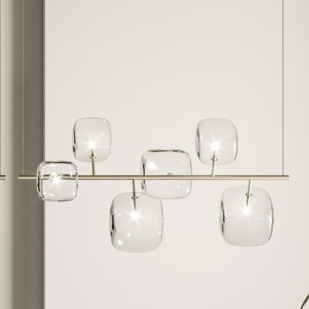 مصباح معلق أفقي بهيكل معدني و6 هياكل مكعبة ومستديرة من زجاج بايركس المنفوخ الشفاف مع مصباح LED G4 3000K قابل للتعتيم داخل كل منها.