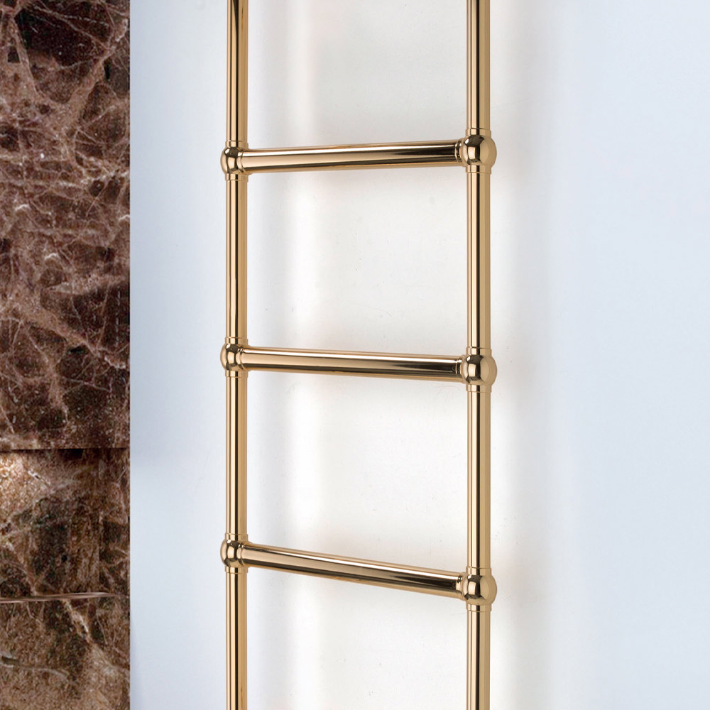 سخان منشفة هيدروليكي من النحاس المطليبالذهب يتكون من عناصر بقطر 1.6 سم وكرات توصيل مصنوعة بالكامل في إيطاليا مع مجموعة تثبيت على الحائط وصمام تنفيس وغطاء أعمى متضمن . هذا المُشعّط أكثر من مجرد مصدر حرارة بسيط، بل هو قطعة أثاث حقيقية تُضفي لمسةً شخصيةً على البيئات التي يوضع فيها وتُكمّلها. يتكامل التصميم والوظيفة ليُنتج منتجًا فريدًا ، ليس جميلًا فحسب، بل عمليًا وفعّالًا أيضًا، بنفس جودة المُشعّط المصنوع بالكامل في إيطاليا.