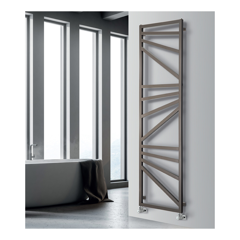 سخان مناشف هيدروليكي من الفولاذ الكربونيبلمسة نهائية رمادية بيج، يتكون من سلسلة من العناصر الأفقية بقطر 3.5 سم، ملحومة على مشعبات رأسية بقطر 3.5 سم. صُنع بالكامل في إيطاليا، ويشمل طقم تثبيت جداري، وصمام تهوية، وسدادة ستارة . الهدف المنشود من هذا العنصر هو جودة صنع إيطالي 100% ، والتي تُحقق في مصنع بمدينة تريفيزو، على بُعد بضعة كيلومترات من البندقية. القيم المنشودة هنا هي العملية والاحترافية والابتكار ، والتي تُنتج مجتمعةً منتجاتٍ تُوازن بين التصميم والفائدة والكفاءة.