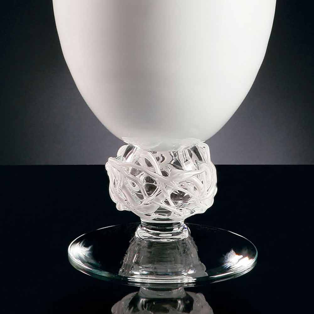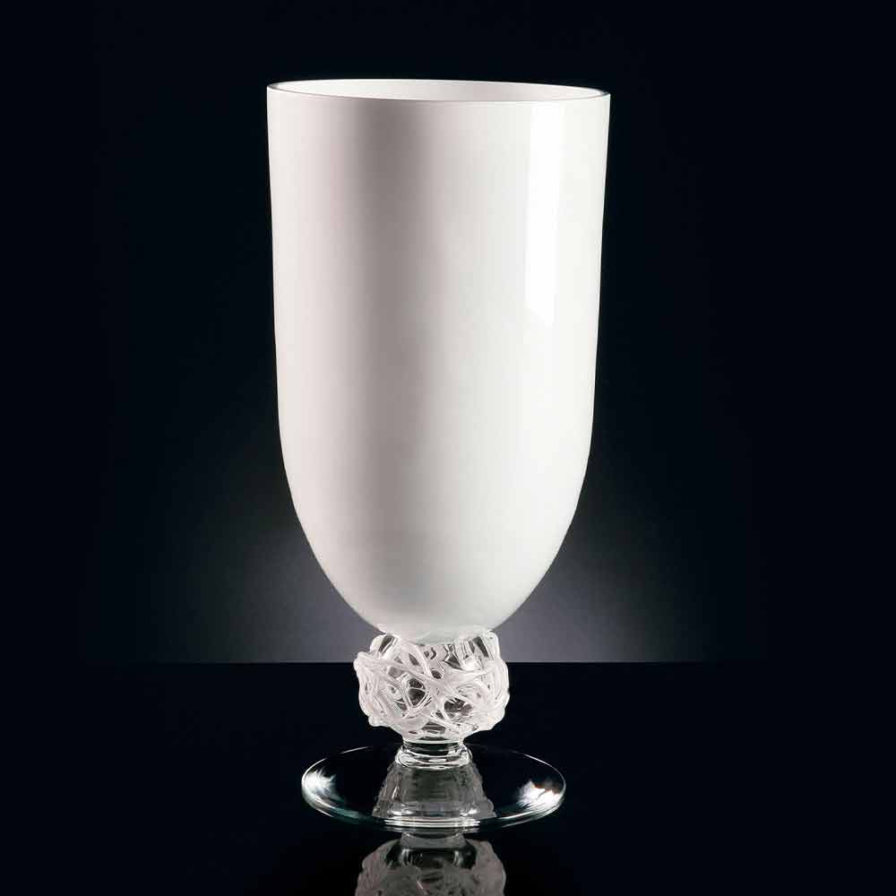 مزهرية مصنوعة يدويًا للديكورات الداخلية من الزجاج الأبيض بقاعدة شفافة صنع في إيطاليا.