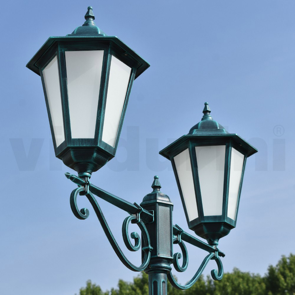 مصباح شارع من الألومنيوم على الطراز العتيق مزود بمصباحين مع موزع زجاجي صنع في إيطاليا.