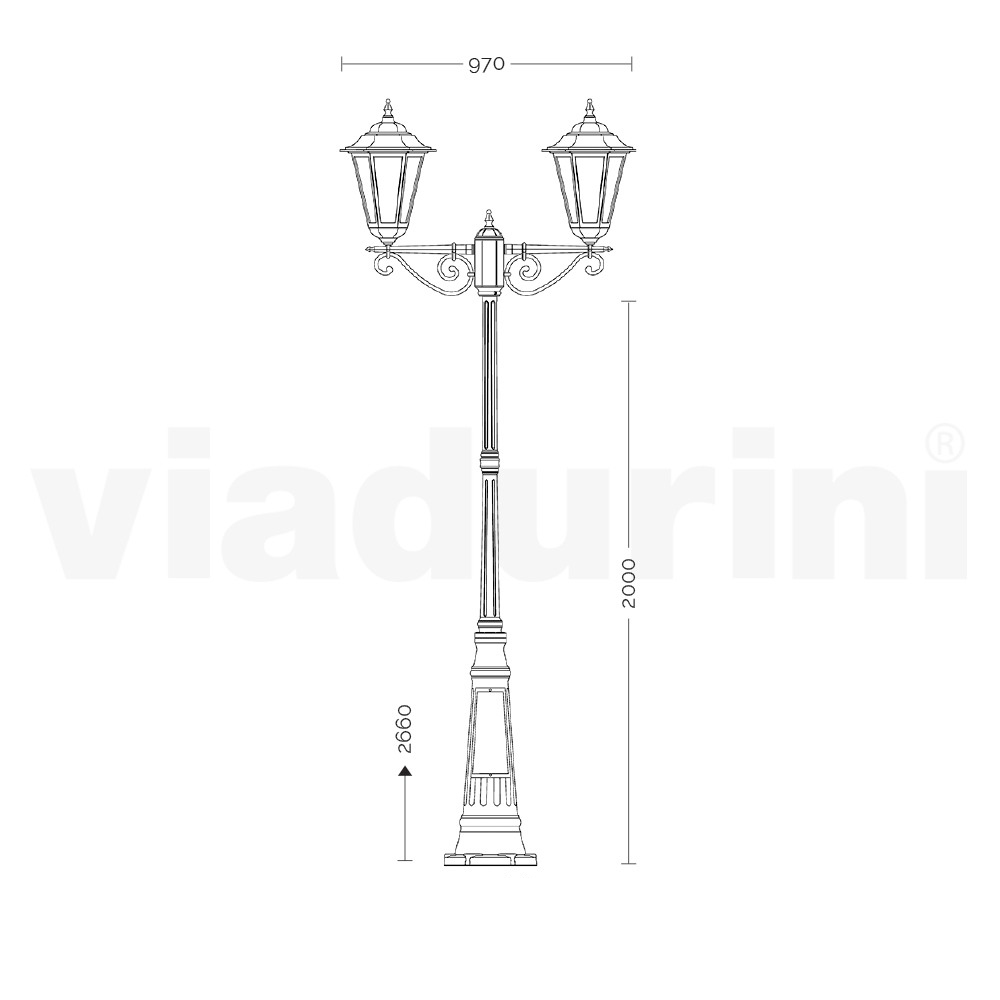 مصباح حديقة بضوءين،مصنوع بالكامل في إيطاليا ، بهيكل من الألومنيوم المصبوب وموزع زجاجي . مزود ببراغي من الفولاذ المقاوم للصدأ. تصميم أنيق يجمع بين الطابع الكلاسيكي والعملية، ليمنحك نتيجة حصرية وعالية الجودة. هيكله البسيط والخطّي مُثري بتفاصيل رائعة ودقيقة تُبرز فرادة المنتج بفضل طابعه الرومانسي. مثالي للبيئات الخارجية كالحدائق والباحات والشوارع والممرات، وكذلك للمساحات الصغيرة كالحانات والمطاعم.