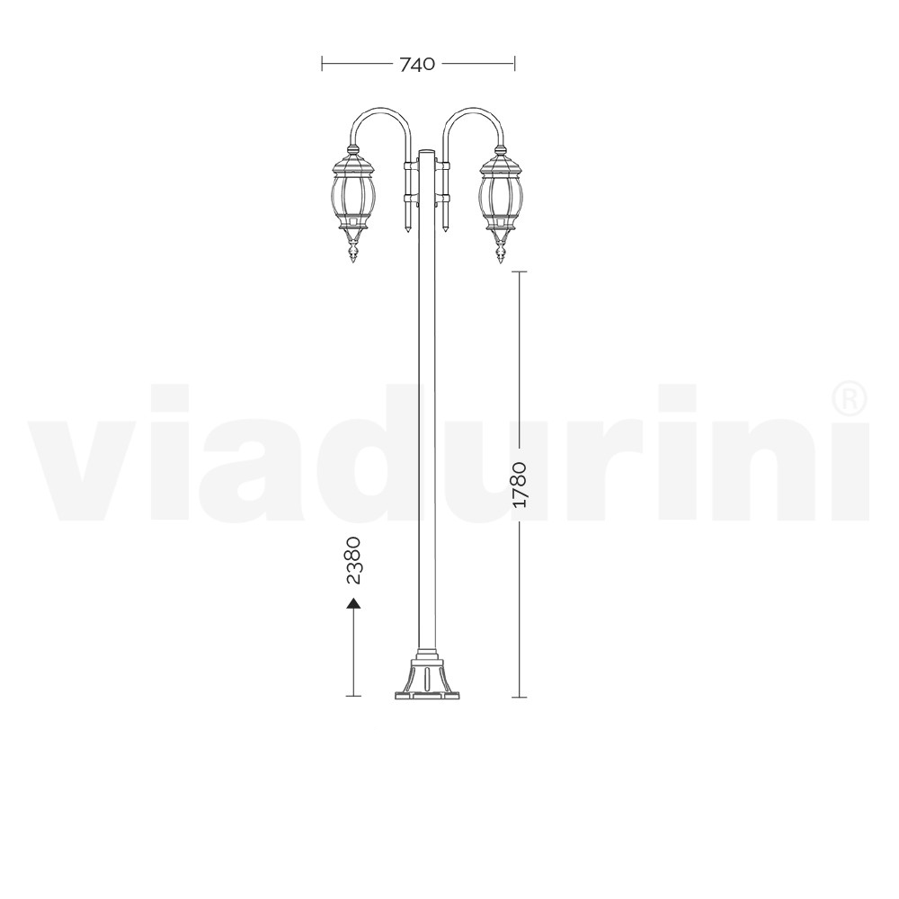 مصباح حديقة بمصباحين،مصنوع بالكامل في إيطاليا، مصنوع من الألومنيوم المصبوب بلمسة نهائية رمادية أنثراسايت، مع موزع هواء شفاف من البولي كربونات . مزود ببراغي من الفولاذ المقاوم للصدأ. قطعة أثاث مثالية للمساحات الخارجية، تتميز بطابع كلاسيكي مميز وأسلوب رومانسي، بتفاصيل راقية ودقيقة تُبرز أناقتها. مثالي للبيئات الخارجية كالحدائق والشوارع والممرات، أو المساحات الخارجية المخصصة للأنشطة التجارية كالحانات والمطاعم.