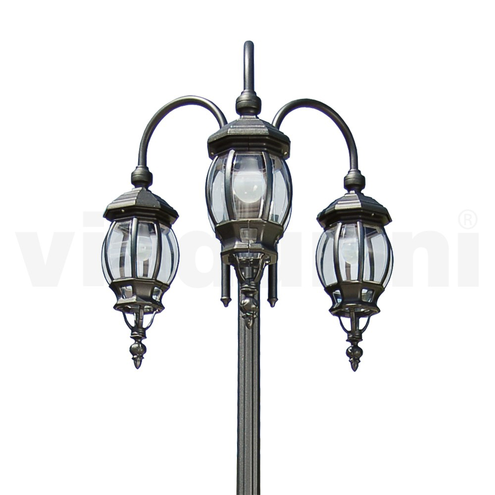 مصباح حديقة بثلاثة مصابيح، بهيكل من الألومنيوم المصبوب ، ولمسة نهائية رمادية أنثراسايت، وموزع شفاف من البولي كربونات . مزود ببراغي من الفولاذ المقاوم للصدأ. مصنوع بالكامل في إيطاليا ، هذا الملحق الأنيق للأثاث هو ثمرة مزيج مثالي بين دقة اللمسة النهائية والزخارف الرائعة التي تغطي الهيكل بأكمله، ليضفي على عمود الإنارة لمسةً من الكلاسيكية والرومانسية .مثالي للمساحات الخارجية مثل الحدائق والطرق والممرات، ولكن أيضًا للبيئات المتعاقدة مثل الحانات والمطاعم.