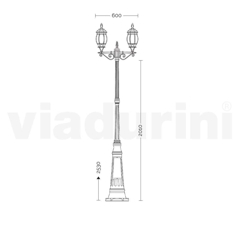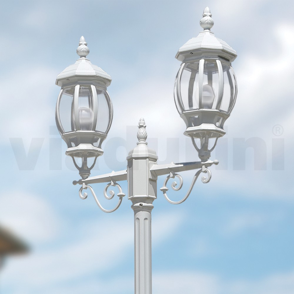 مصباح حديقة بضوءين من الألومنيوم المصبوب مع موزع شفاف من البولي كربونات، مصنوع بالكامل في إيطاليا . مزود ببراغي من الفولاذ المقاوم للصدأ. تصميم أنيق بلمسة رومانسية، يتميز بتفاصيل رائعة وزخارف دقيقة، مما يجعل هذه القطعة من الأثاث الخارجي حلاً مثاليًا لعشاق الطراز الكلاسيكي والأنيق . مثالي للبيئات الخارجية كالحدائق والشوارع والممرات، أو المساحات الخارجية المخصصة للأنشطة الخارجية كالحانات والمطاعم.