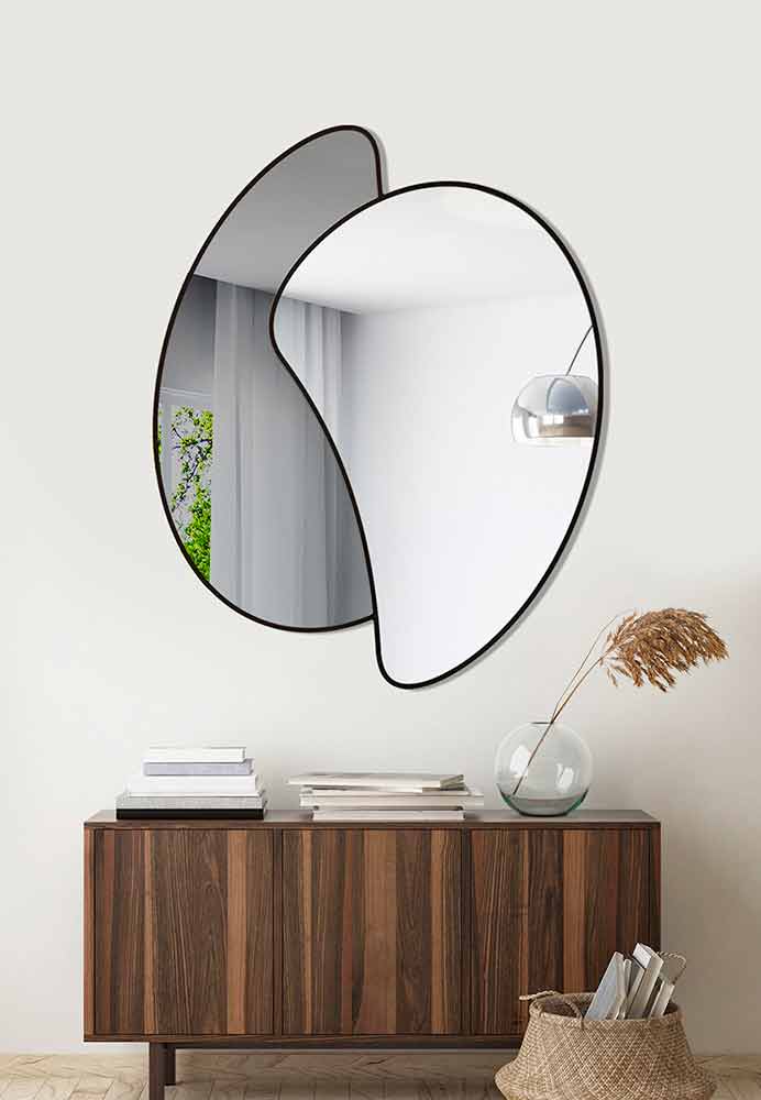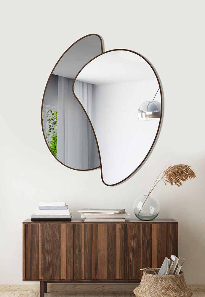 تتكون مرآة الحائط البسيطة هذه من مرآتين، إحداهما بلون دخاني، بخطوط أنيقة وأشكال حديثة مدمجة مع لمسات نهائية مطلية راقية للحصول على نتيجة ذات تأثير جمالي بسيط وزخرفي، بأسلوب فريد من نوعه.