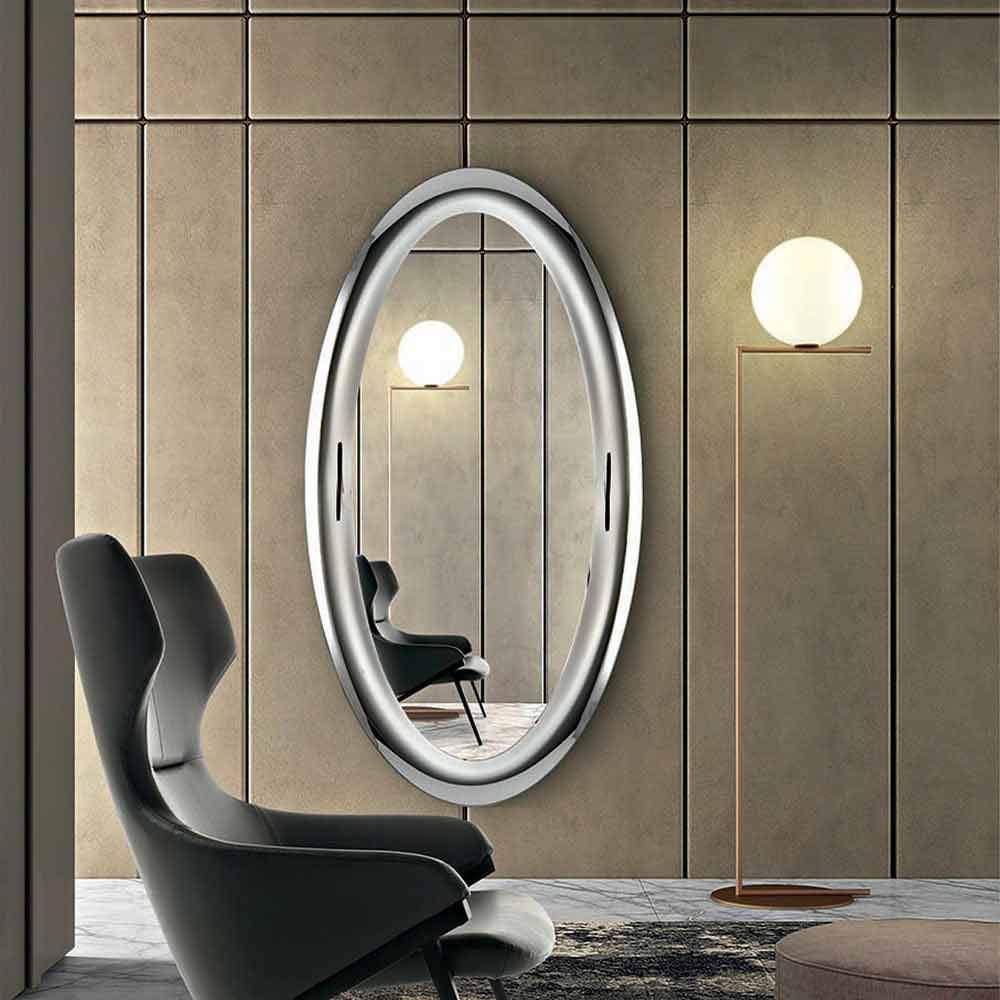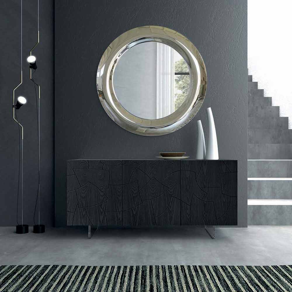 مرآة حائط مصنوعة في إيطاليا مع مرآة داخليةمصنوعة من الزجاجمع لمسة نهائية من الكريستال العاكس وإطار محدب أيضًا بلمسة نهائية من الكريستال العاكس . إن استخدام الخطوط البسيطةوالأساسية جنبًا إلى جنب مع التشطيبات الأنيقة للغاية يعطي الحياة لإكسسوار تأثيث بسيط لا يمر دون أن يلاحظه أحد بفضل أبعاده المهيبة واستخدام الشكل الدائري الذي يعطي الحركةوالانسجام للداخل من البيئة.